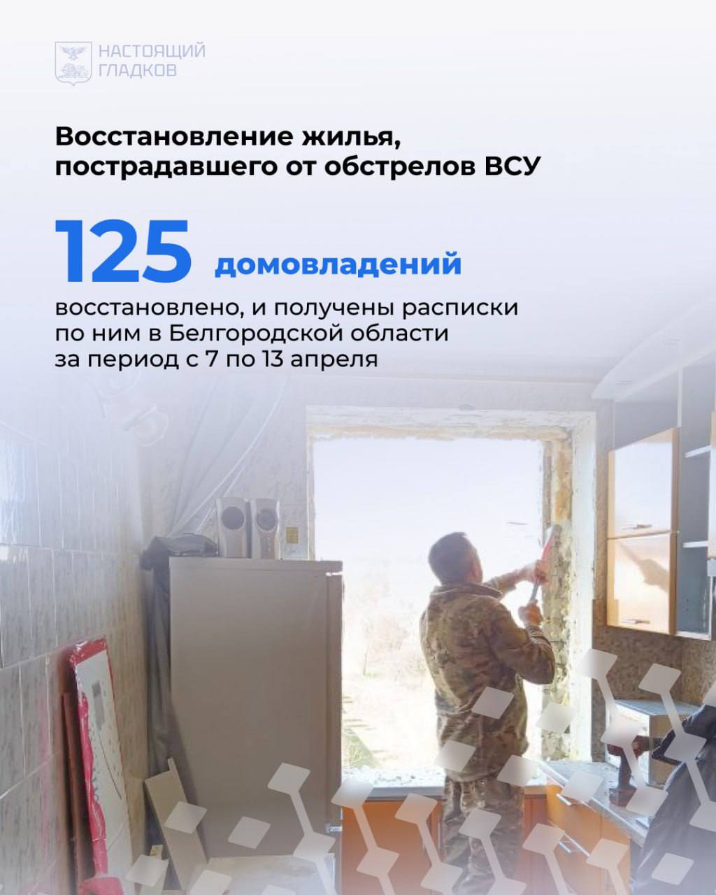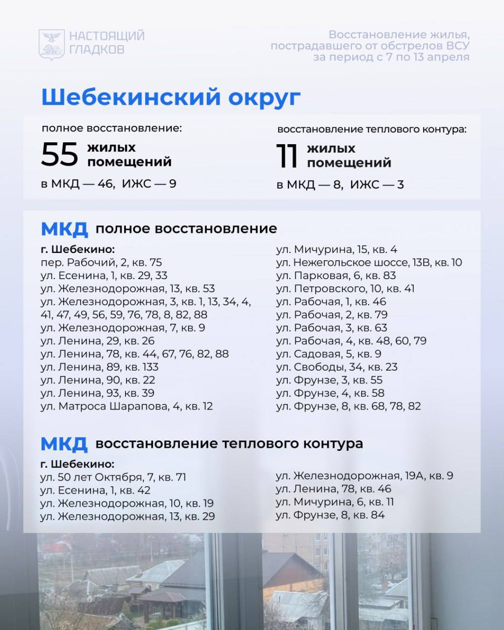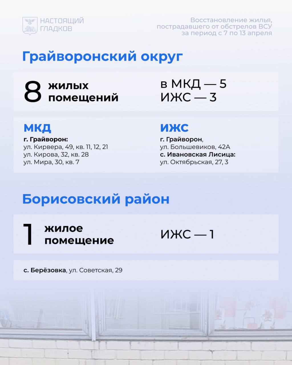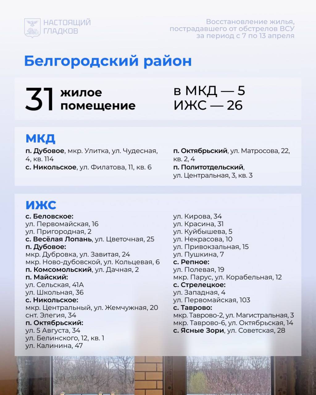 В Белгородском районе за неделю полностью восстановлен 31 объект. Также за этот период выявлено 29 повреждённых жилых помещений и шесть автомобилей.