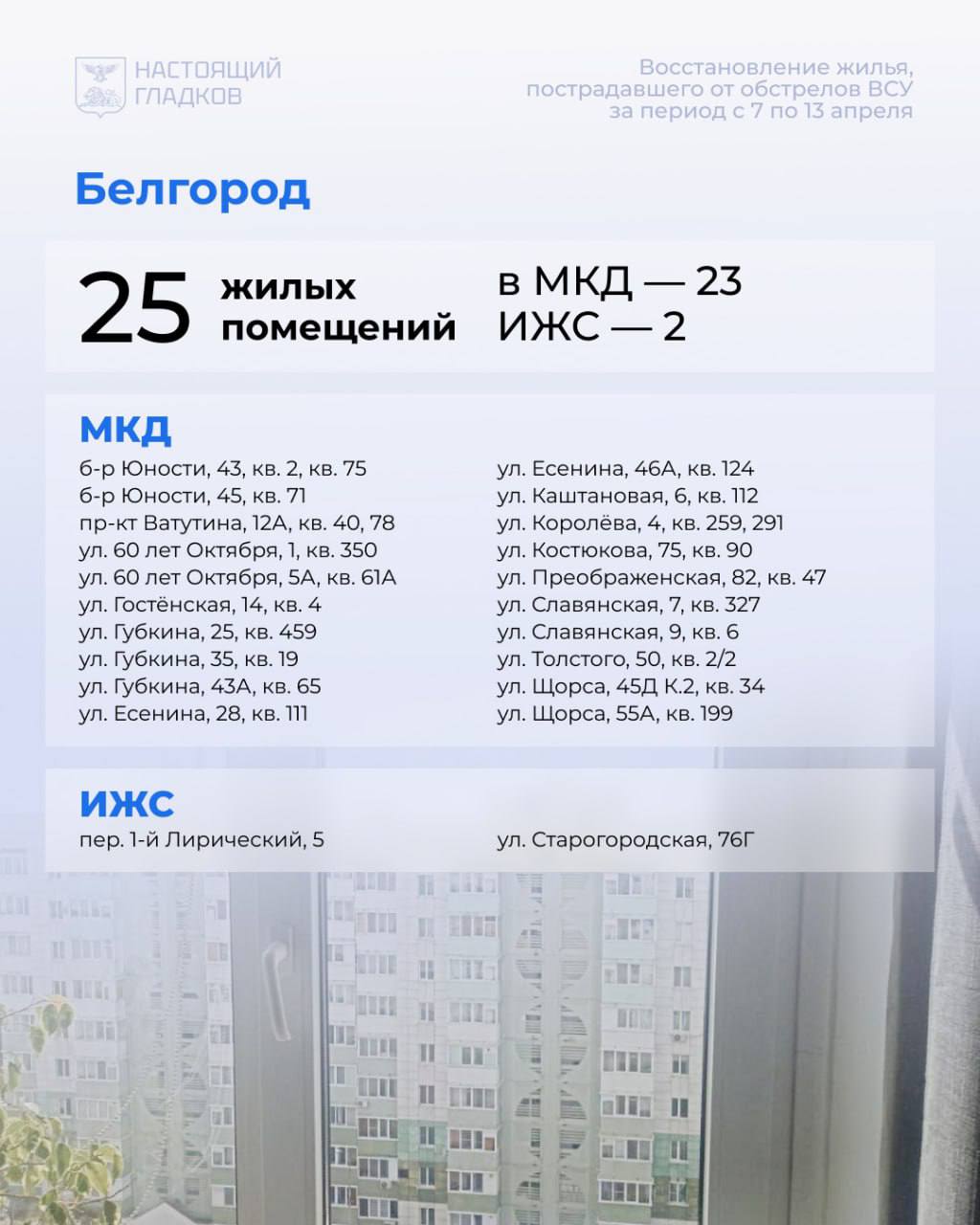 В Белгороде сдано 25 объектов, в работе остаются 85 жилых помещений. На прошлой неделе повреждено 12 домов и квартир.