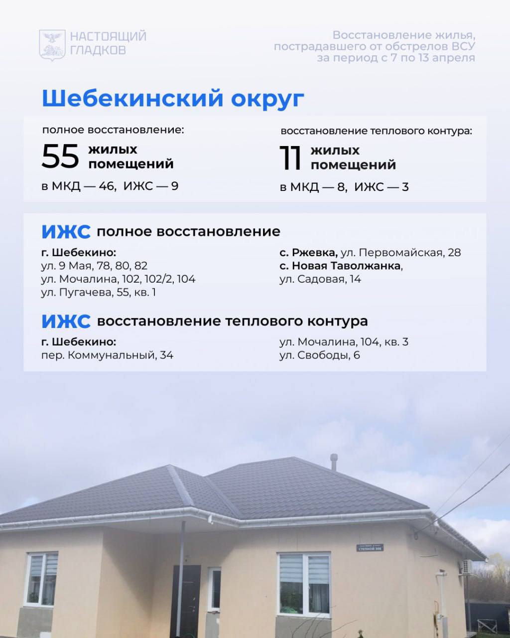 В Шебекинском округе завершены работы на 55 объектах, закрыт контур на 11 объектах. За неделю выявлено 74 повреждённых дома и 19 автомобилей.