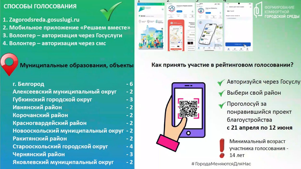 Поучаствовать в голосовании можно через платформу zagorodsreda.gosuslugi.ru и мобильное приложение «Госуслуги Решаем вместе», рассказали на официальном сайте правительства Белгородской области https://belregion.ru/press/news/index.php?ID=135246