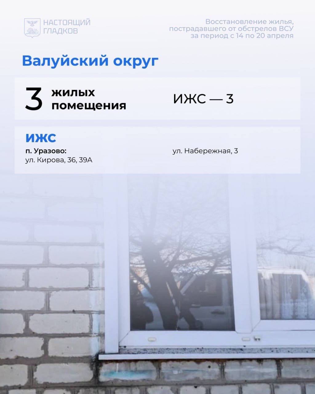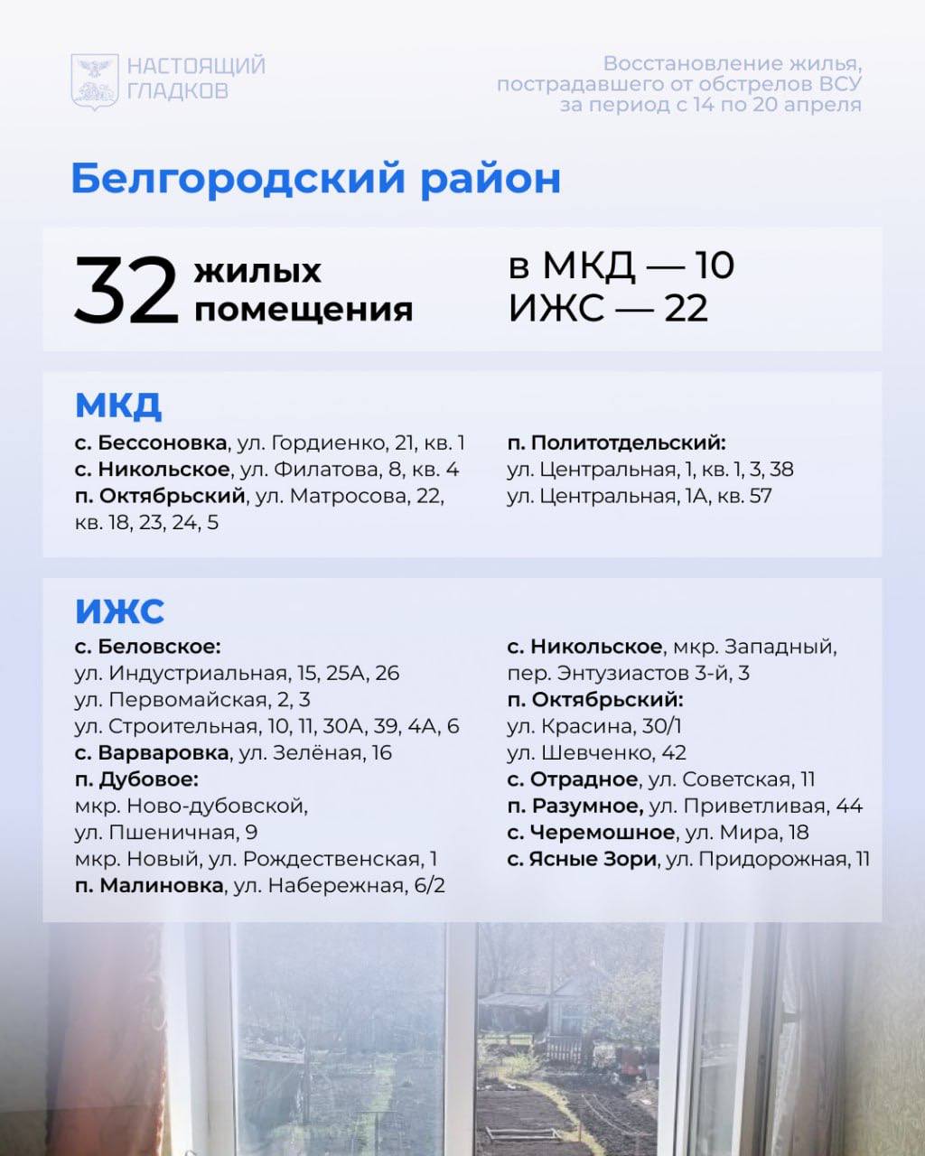 В Белгородском районе за неделю полностью восстановили 32 объекта. Также за этот период выявлено 36 повреждённых жилых помещения и 33 автомобиля.