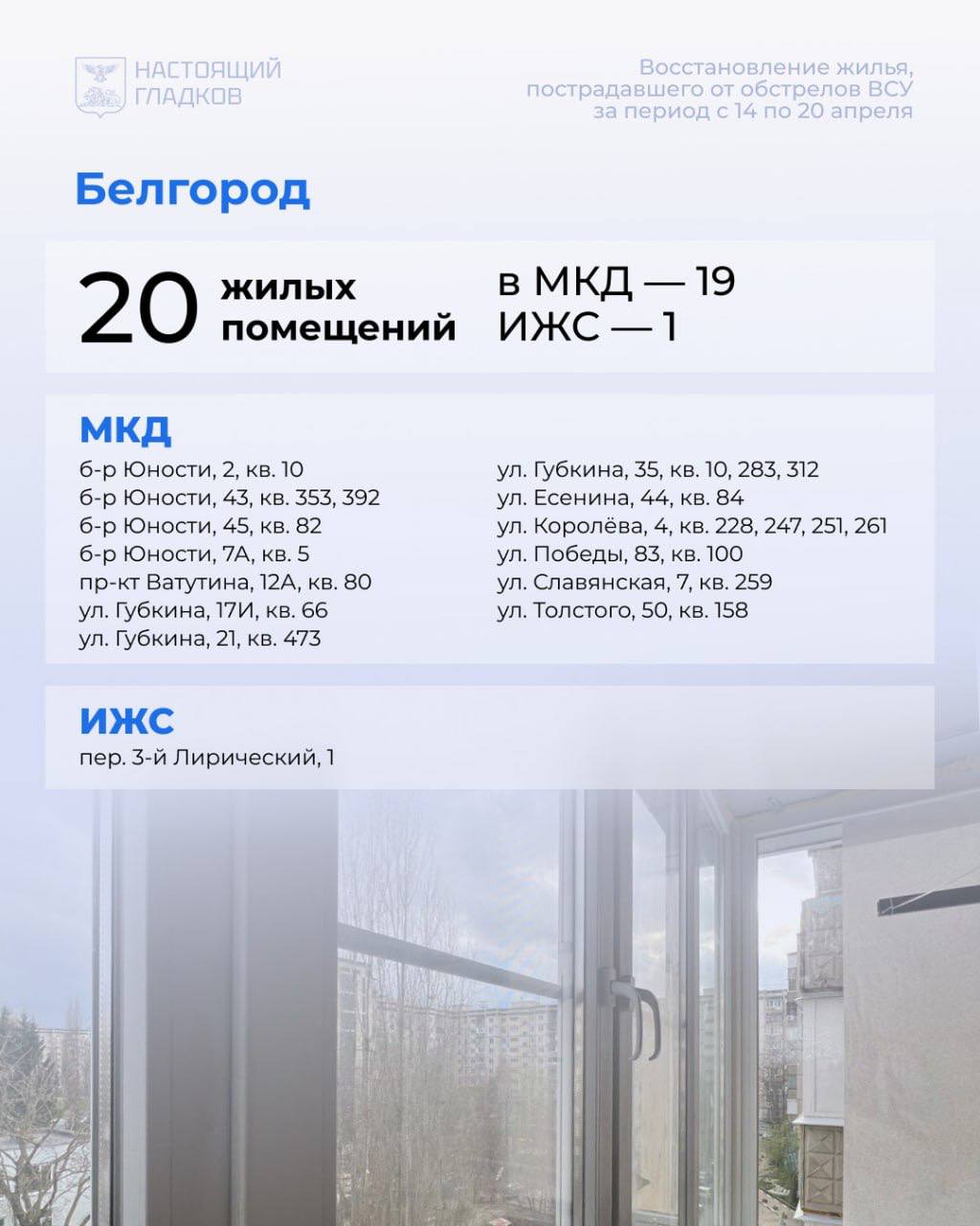 Список адресов, по которым восстановлены дома, опубликовал Вячеслав Гладков.