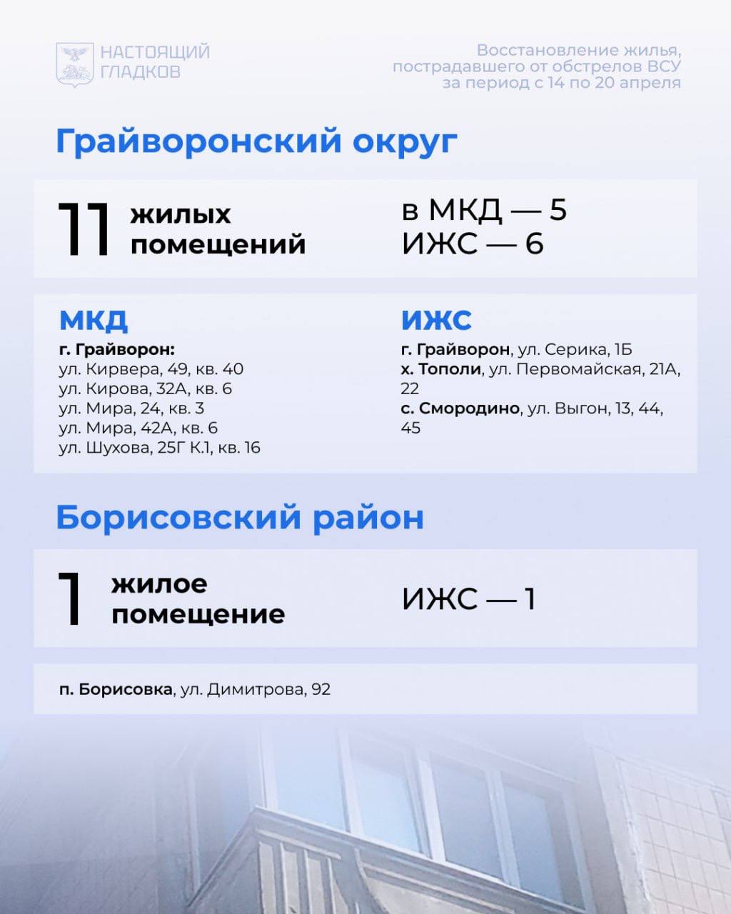 В Грайворонском округе восстановили 11 объектов. За неделю зафиксированы повреждения 31 жилого помещения и 40 машин.