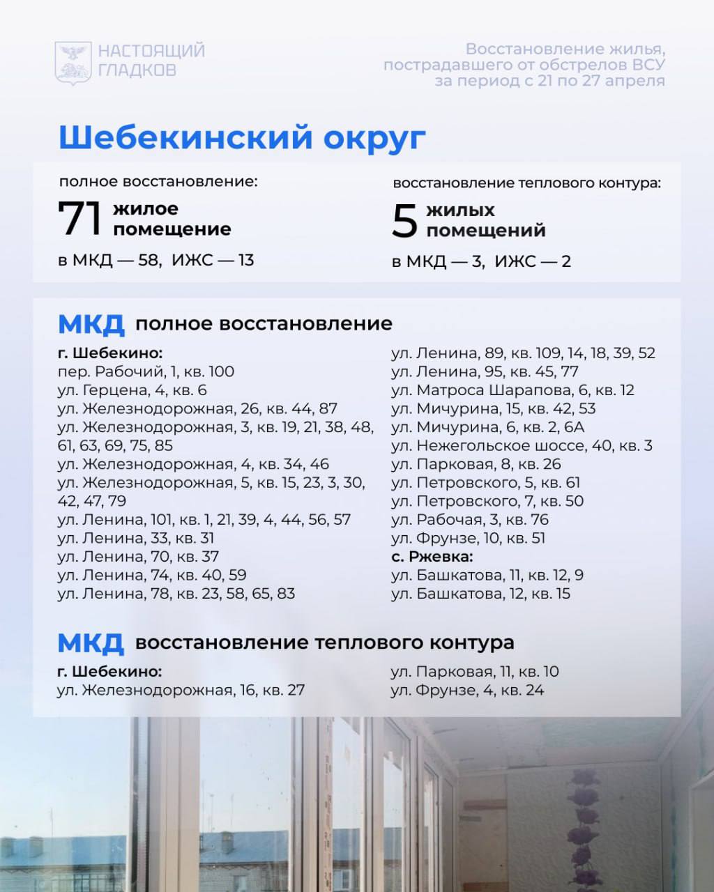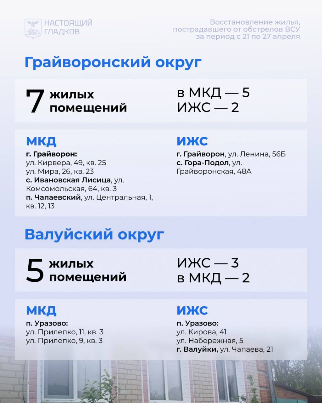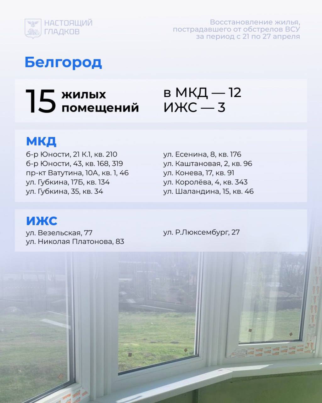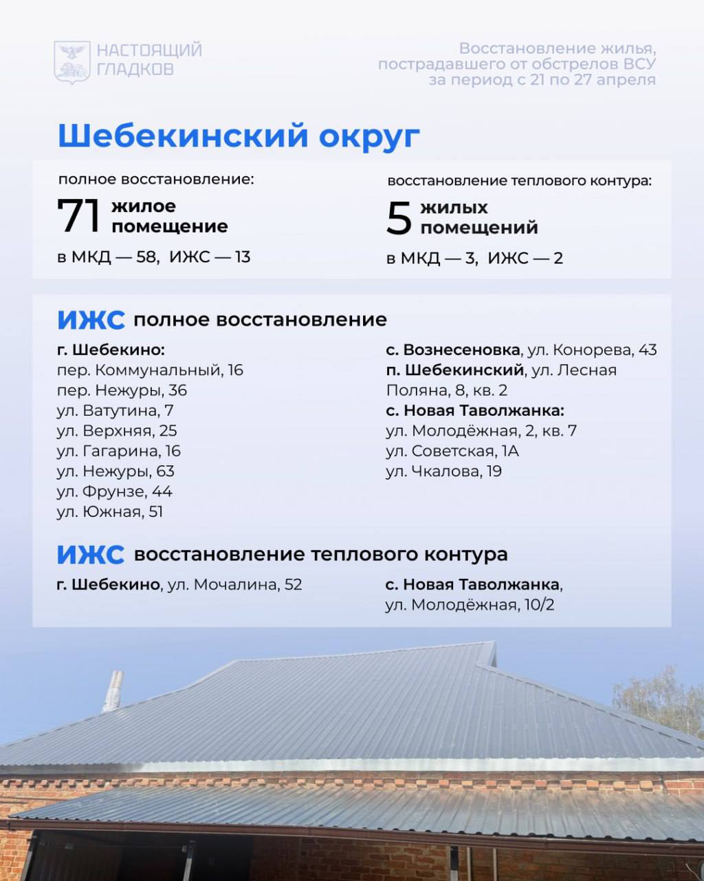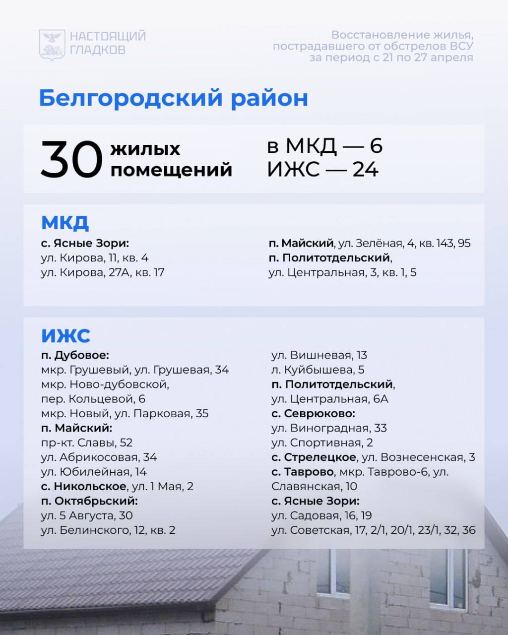 Список адресов, по которым восстановлены дома, опубликовал Вячеслав Гладков.