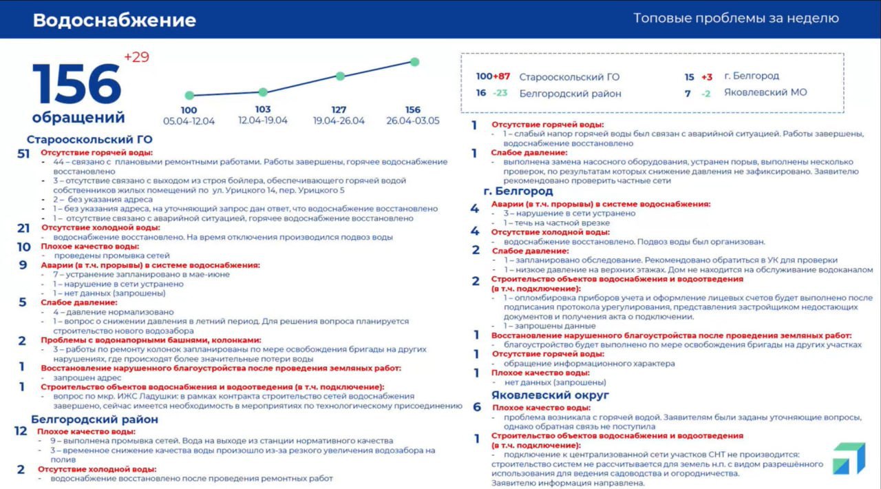 Вячеслав Гладков отметил, что по трём муниципальным образованиям – Старому Осколу, Белгороду и Яковлевскому округу – в последнее время фиксируется рост жалоб на водоснабжение.