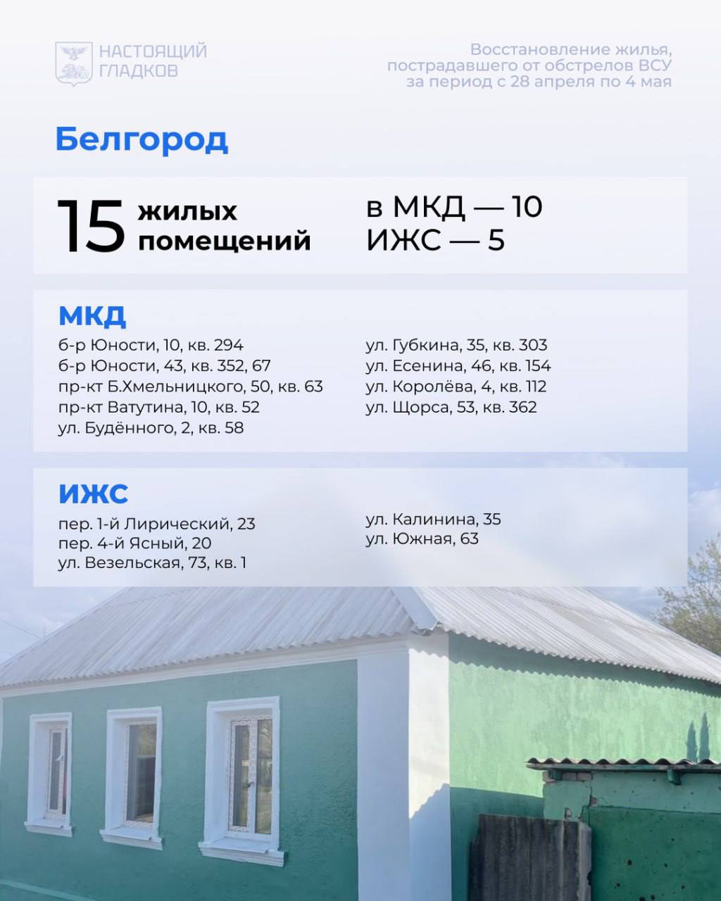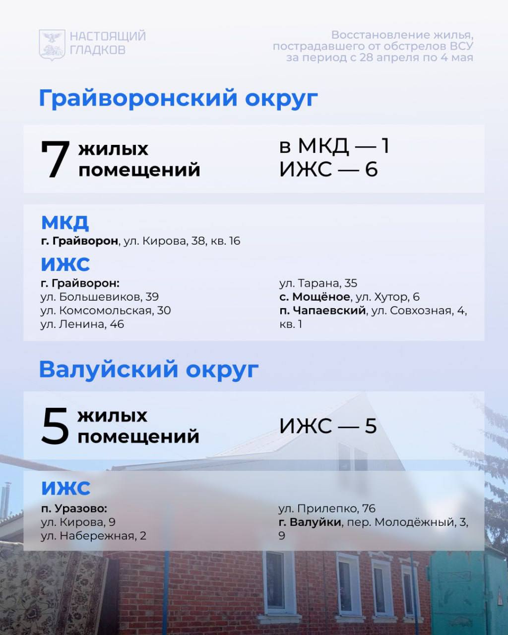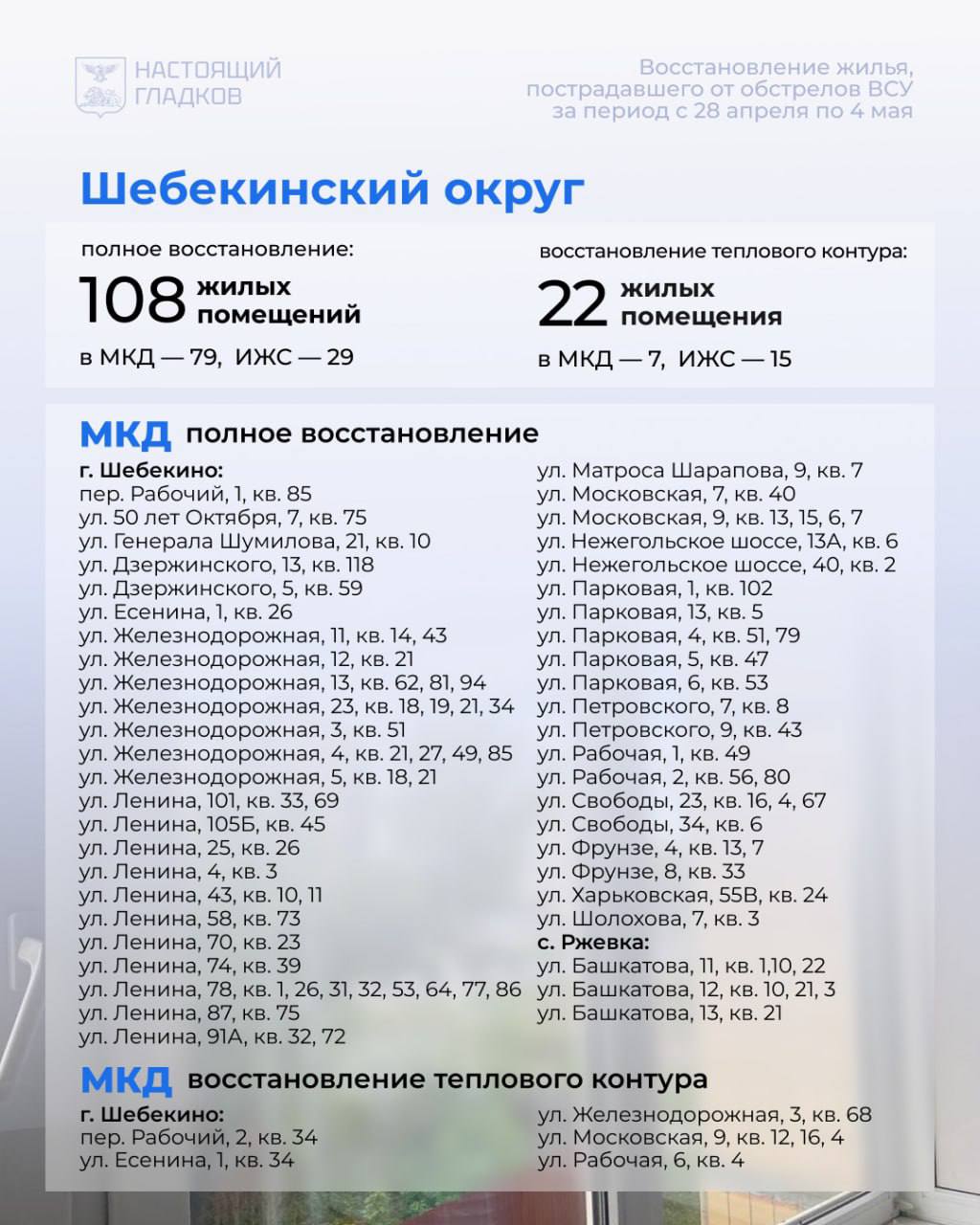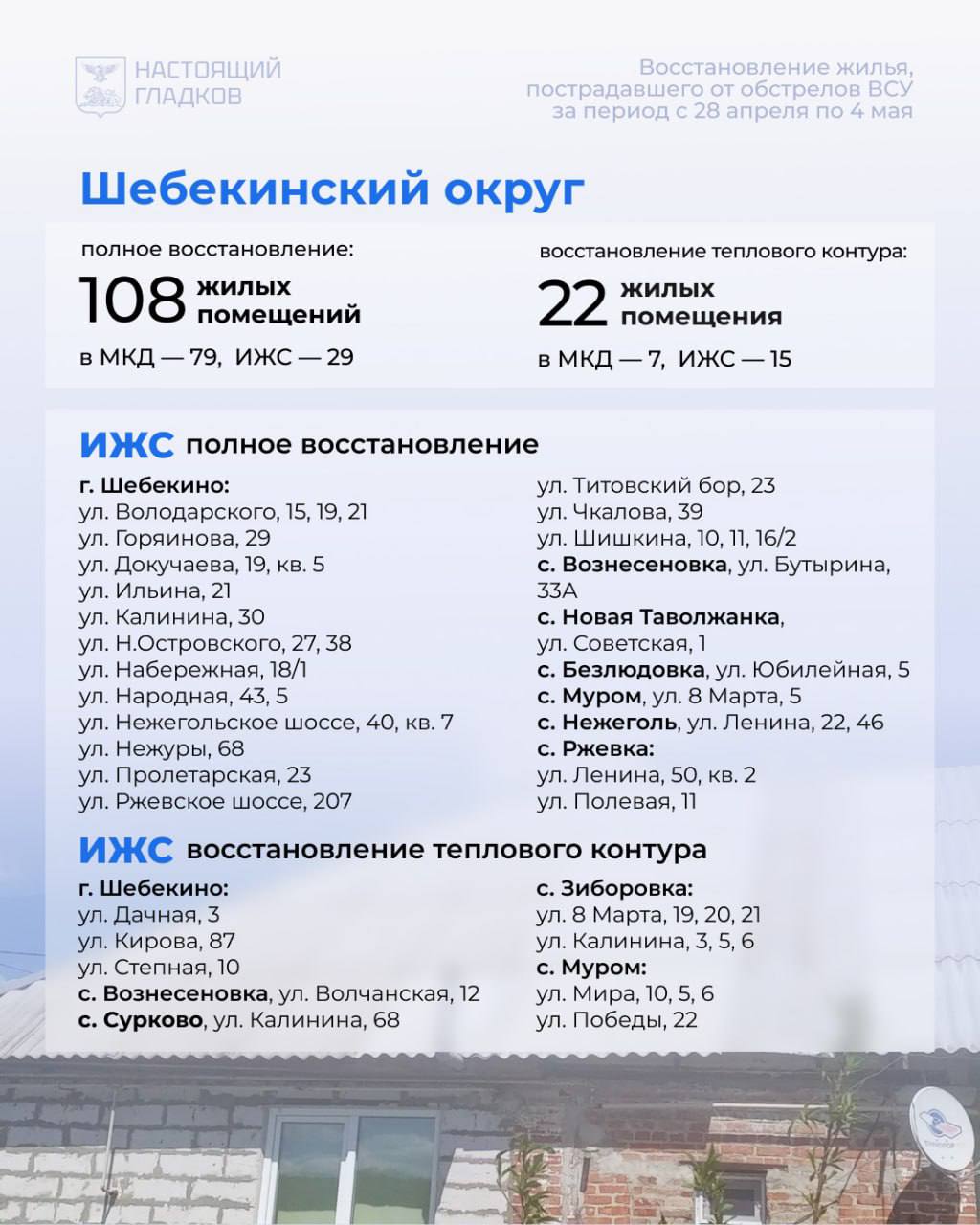 Список адресов, по которым восстановлены дома, опубликовал Вячеслав Гладков.