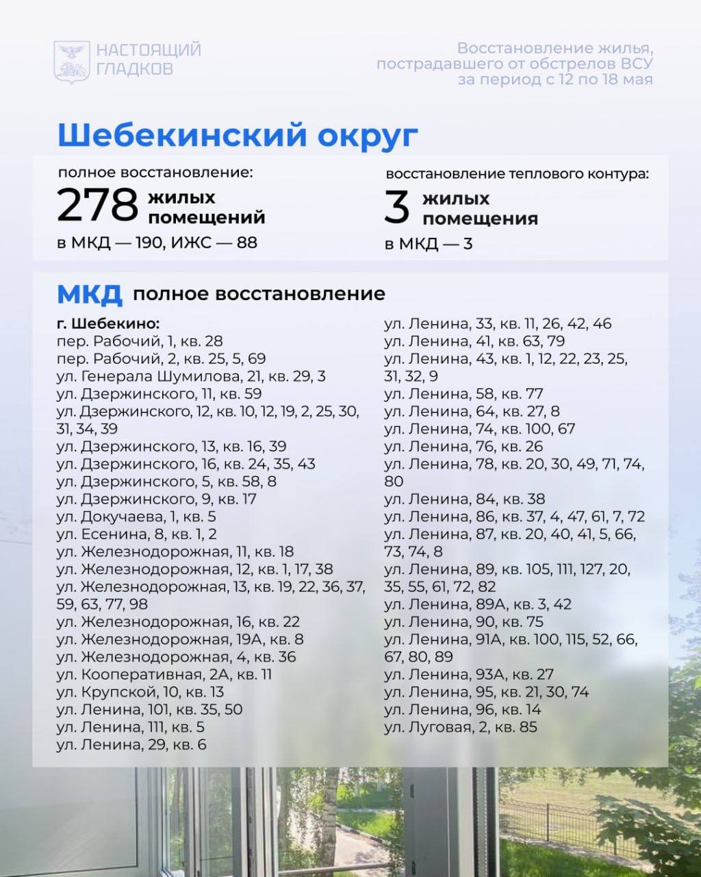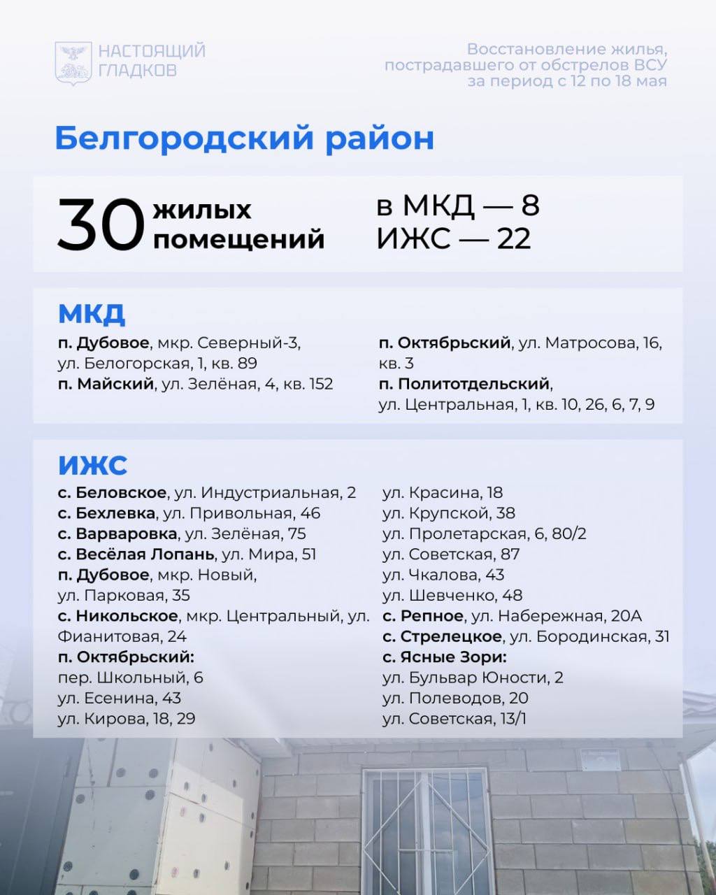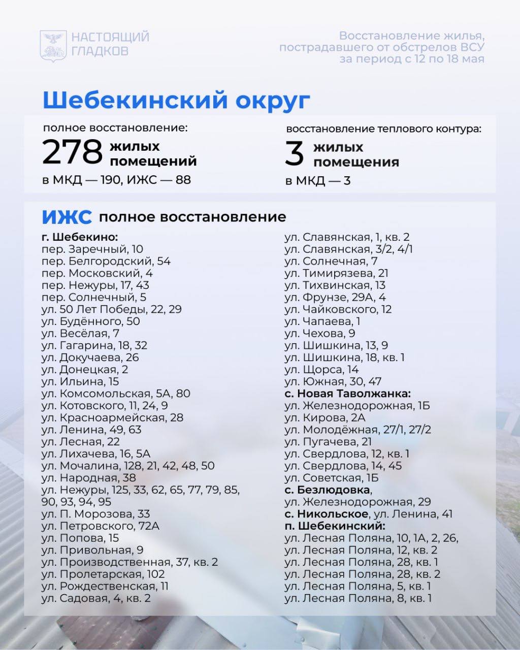 Список адресов, по которым восстановлены дома, опубликовал Вячеслав Гладков.