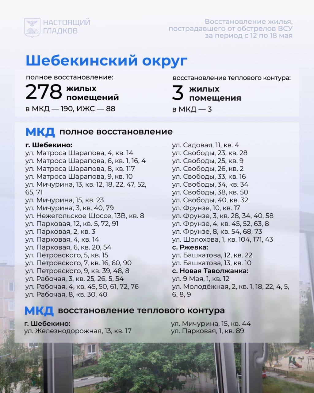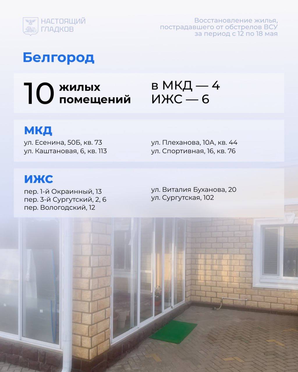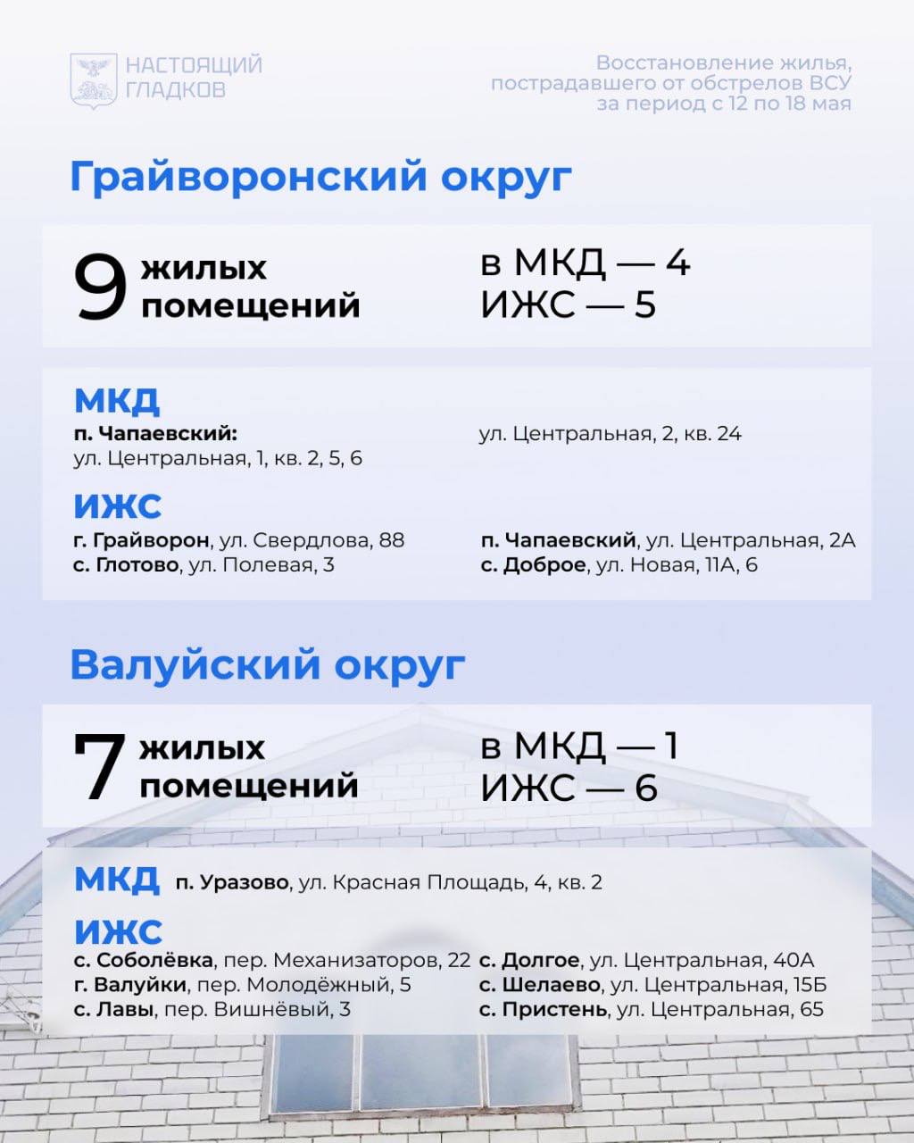 Список адресов, по которым восстановлены дома, опубликовал Вячеслав Гладков.