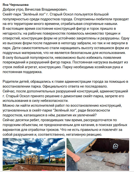Глава Старооскольского округа Владимир Жданов рассказал, что при эксплуатации скейт-площадка получила серьёзные повреждения и не подлежит ремонту.