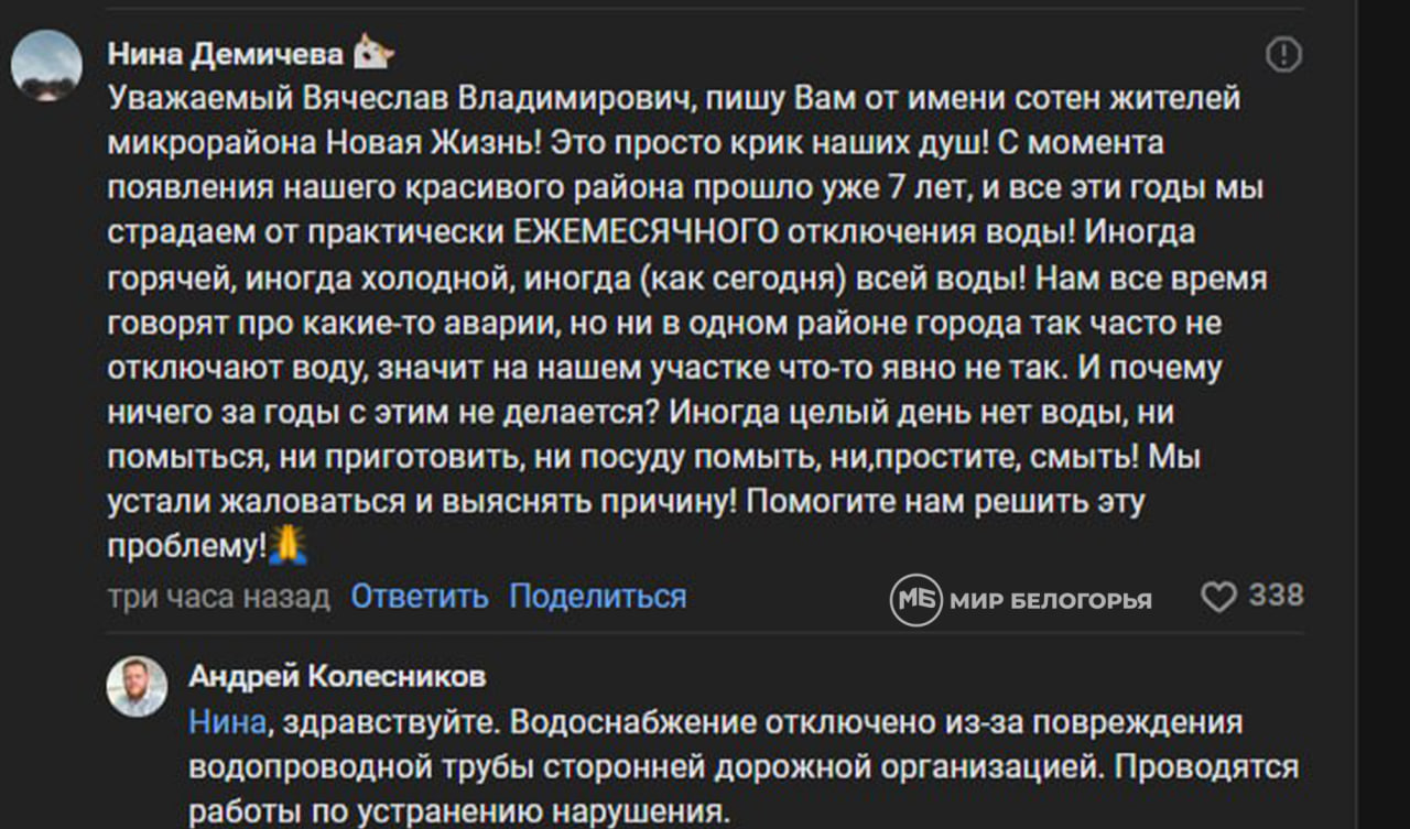 На комментарий ответил и.о.генерального директора ГУП «Белоблводоканал» Андрей Колесников. Он пояснил, что очередное отключение связано с повреждением водопроводной трубы сторонней дорожной организацией.