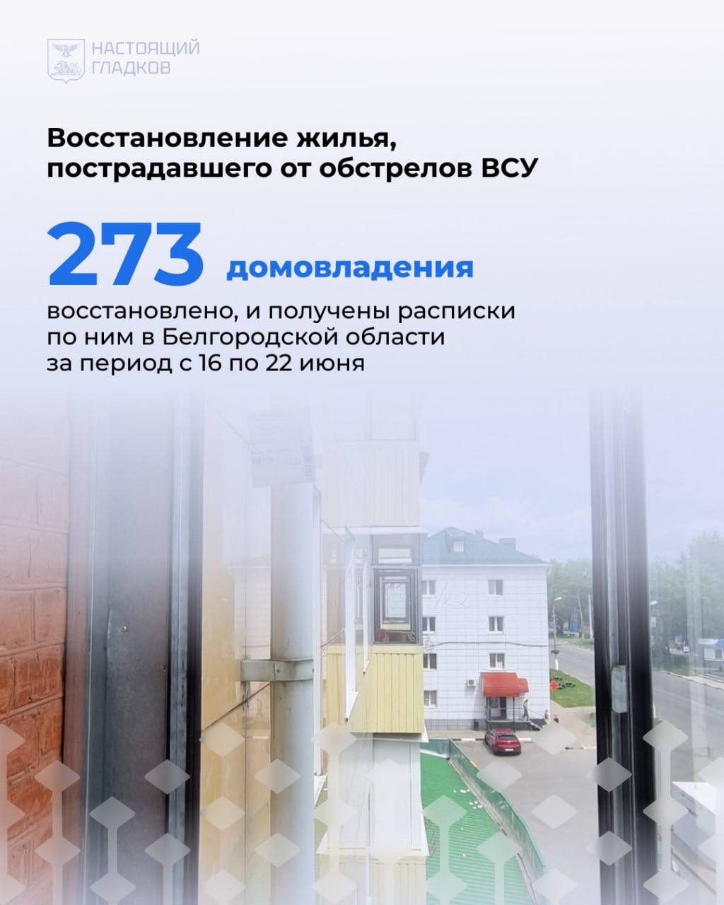 В Белгородском районе за неделю полностью восстановили 54 объекта. Также за этот период выявили повреждения 29 жилых помещений и 11 автомобилей.