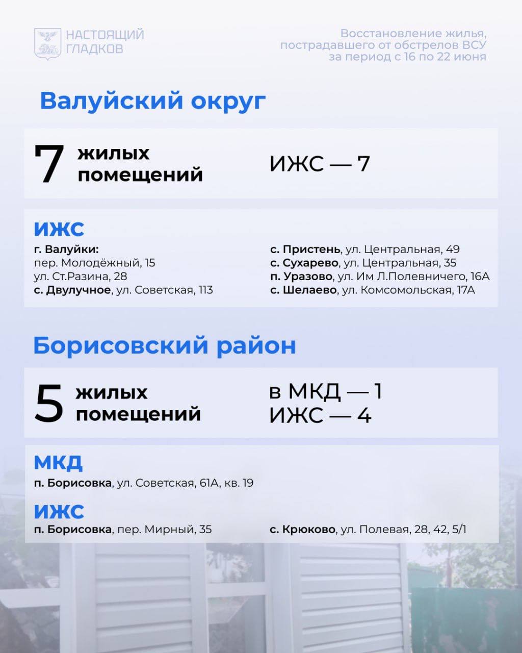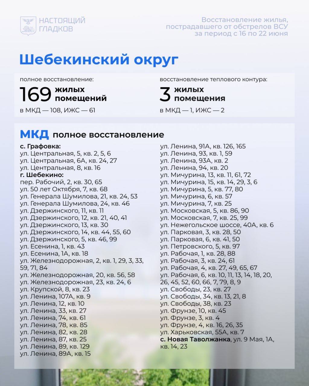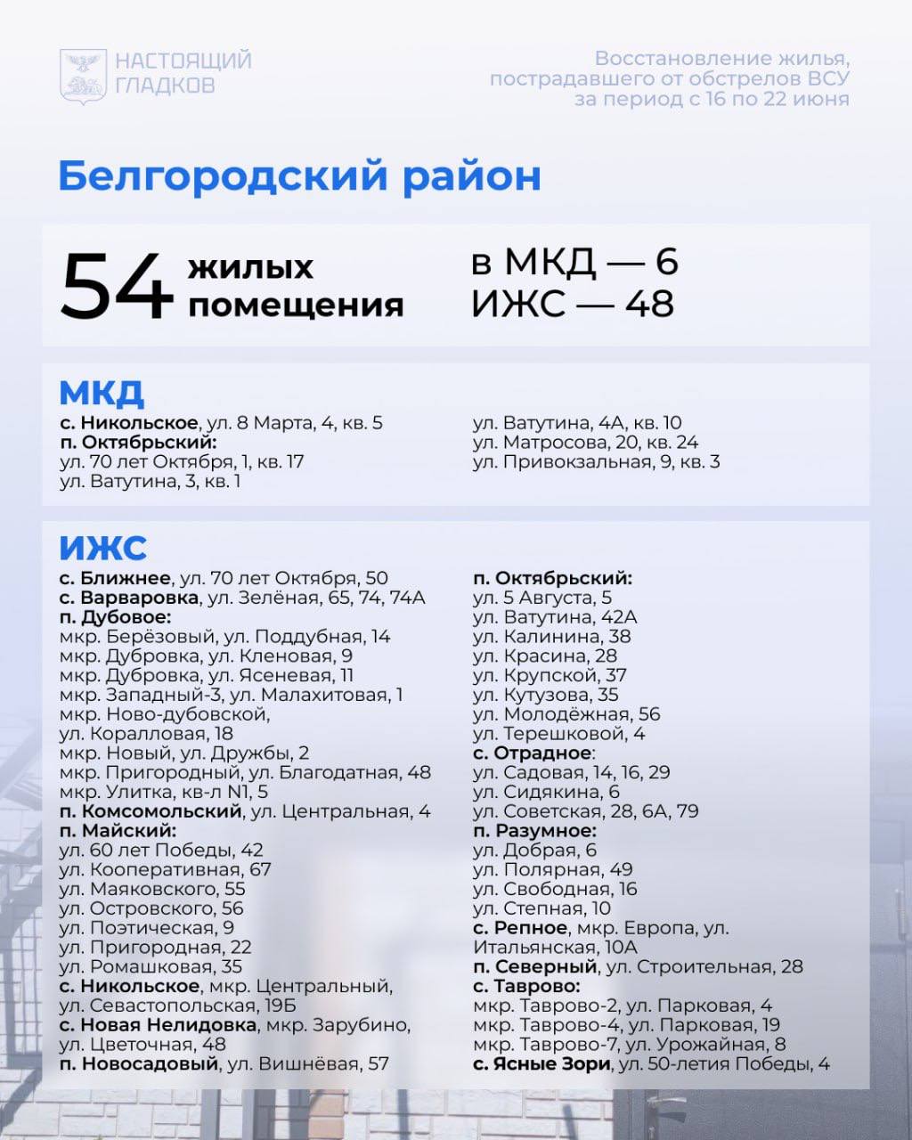 Список адресов, по которым восстановлены дома, опубликовал Вячеслав Гладков.