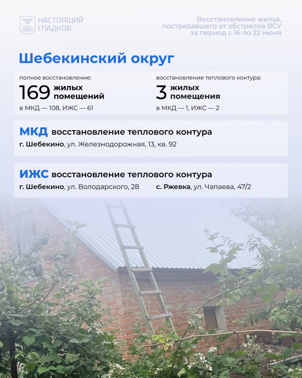 В Шебекинском округе завершили работы на 169 объектах, закрыли контур на трёх. За неделю выявили повреждения 79 домов и 38 машин.