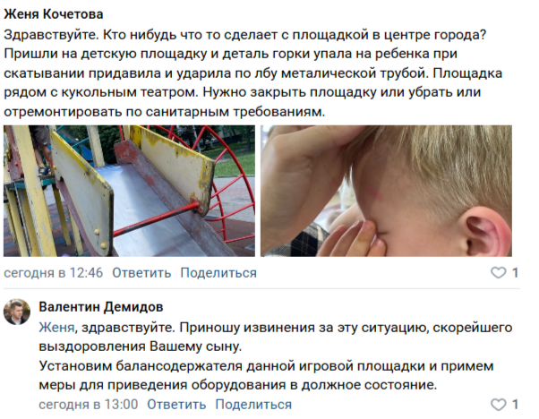 «Установим балансодержателя данной игровой площадки и примем меры для приведения оборудования в должное состояние», – ответил градоначальник.