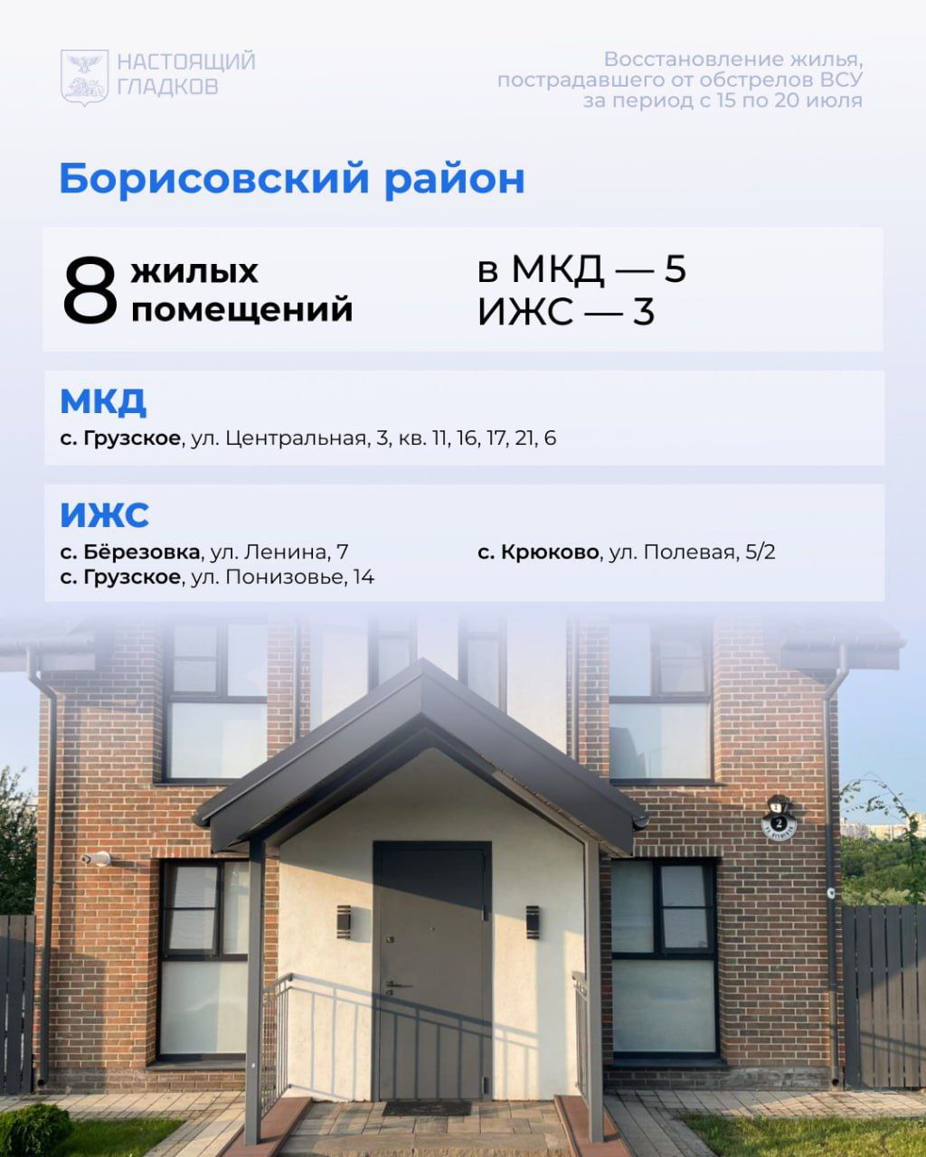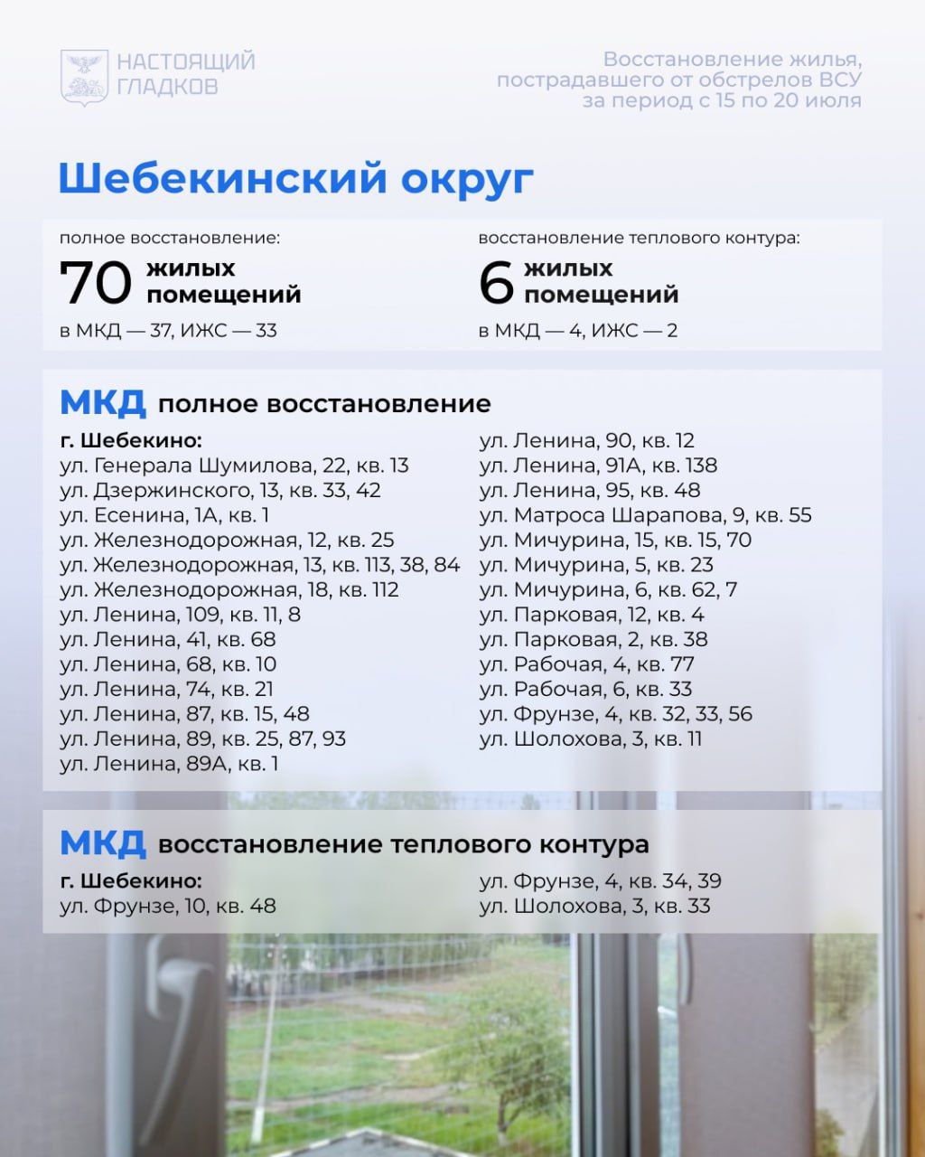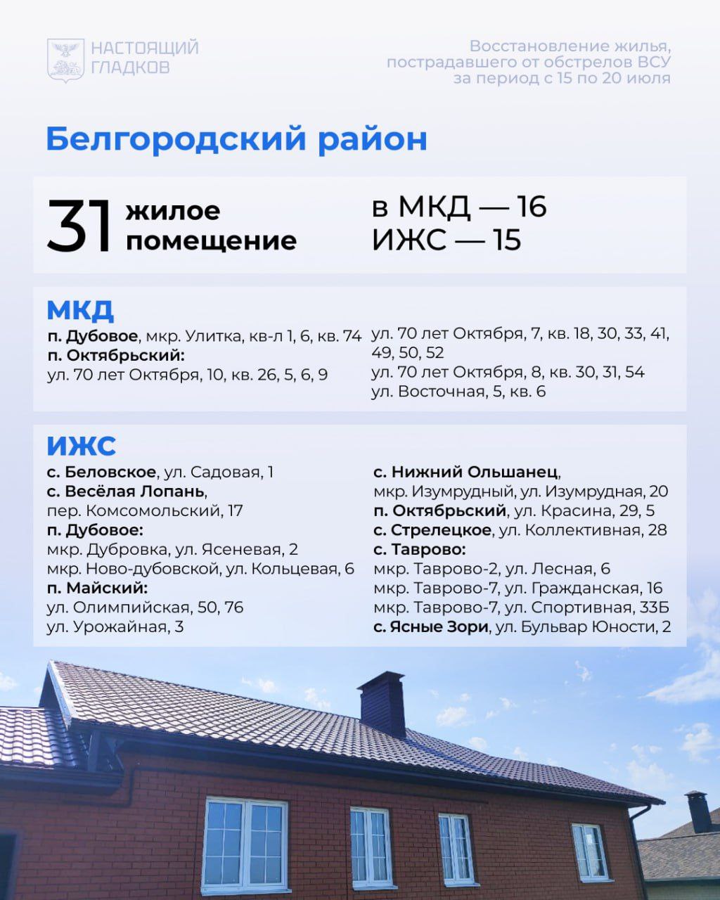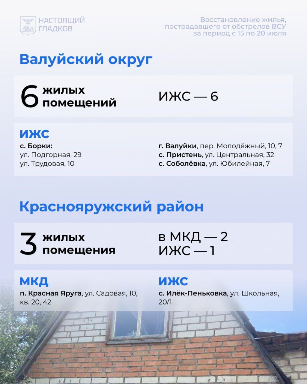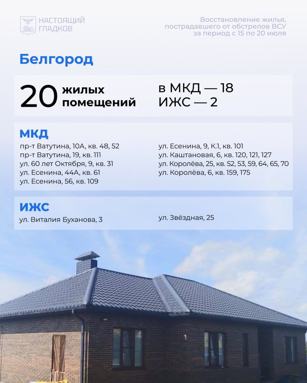 Список адресов, по которым восстановлены дома, опубликовал Вячеслав Гладков.