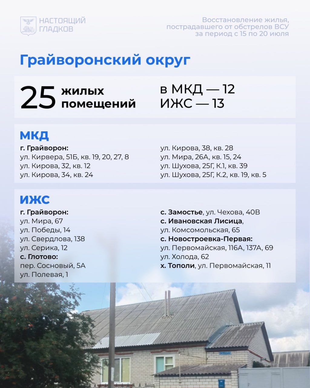 В Грайворонском округе восстановили 25 объектов. За неделю зафиксированы повреждения 20 жилых помещений и пяти автомобилей.