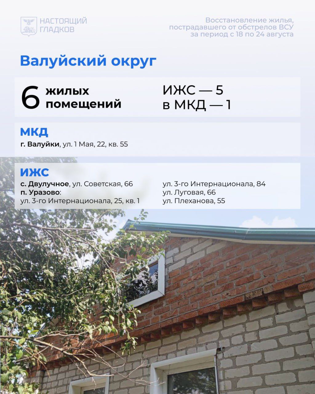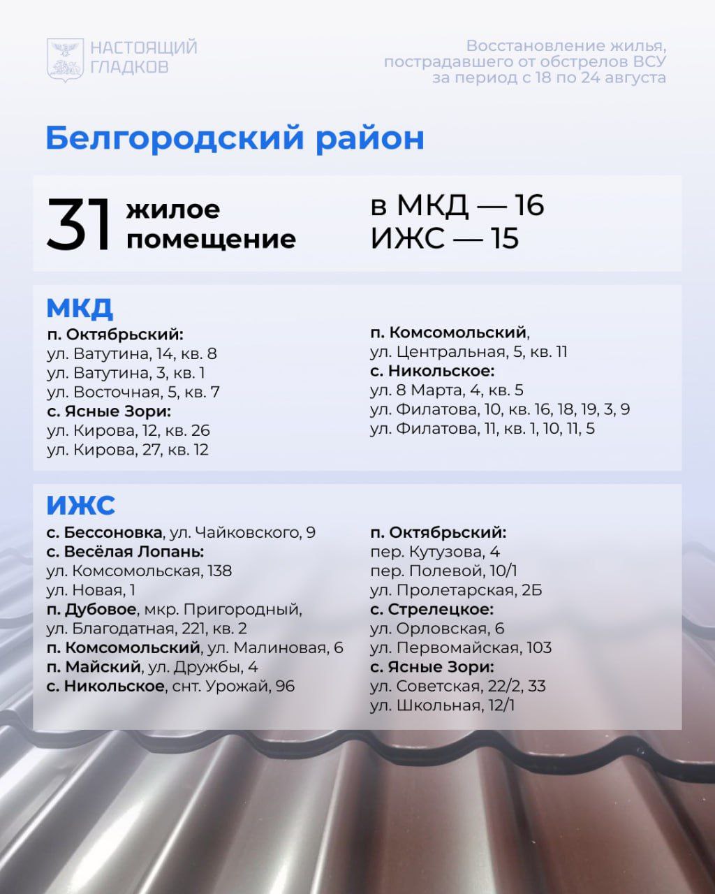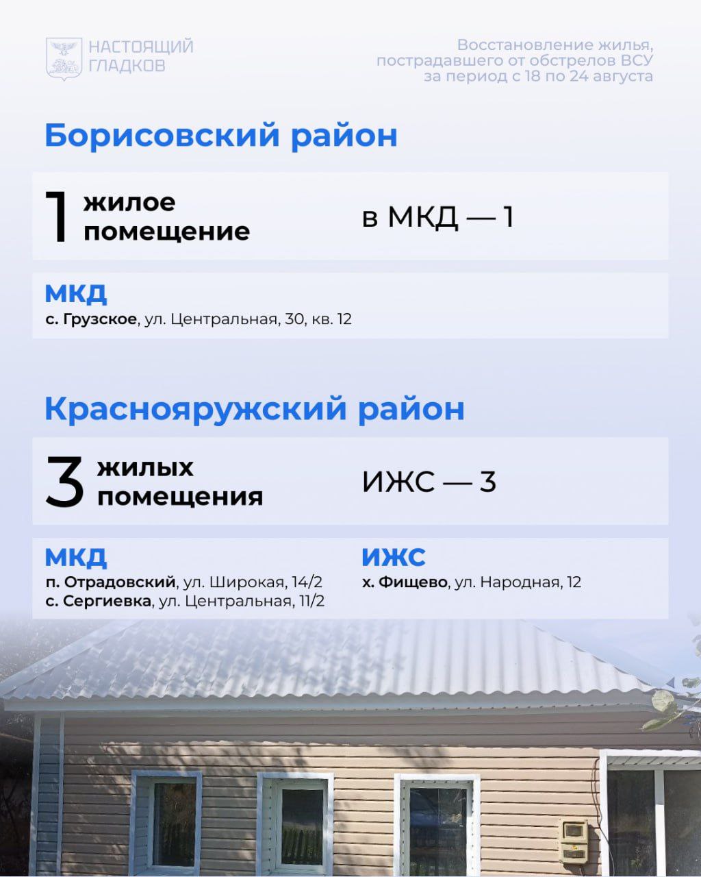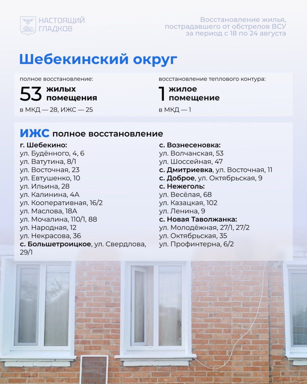 Список адресов, по которым восстановлены дома, опубликовал Вячеслав Гладков.