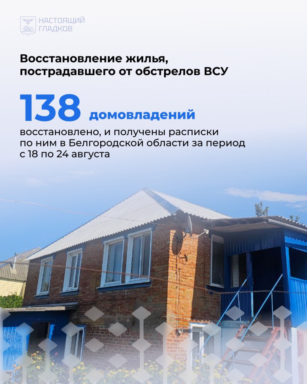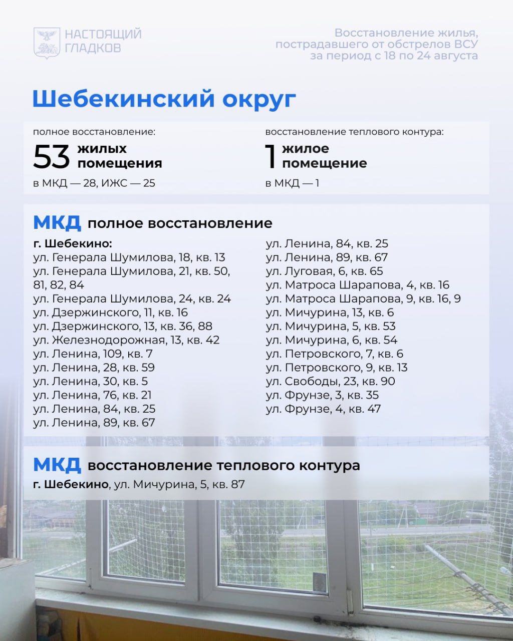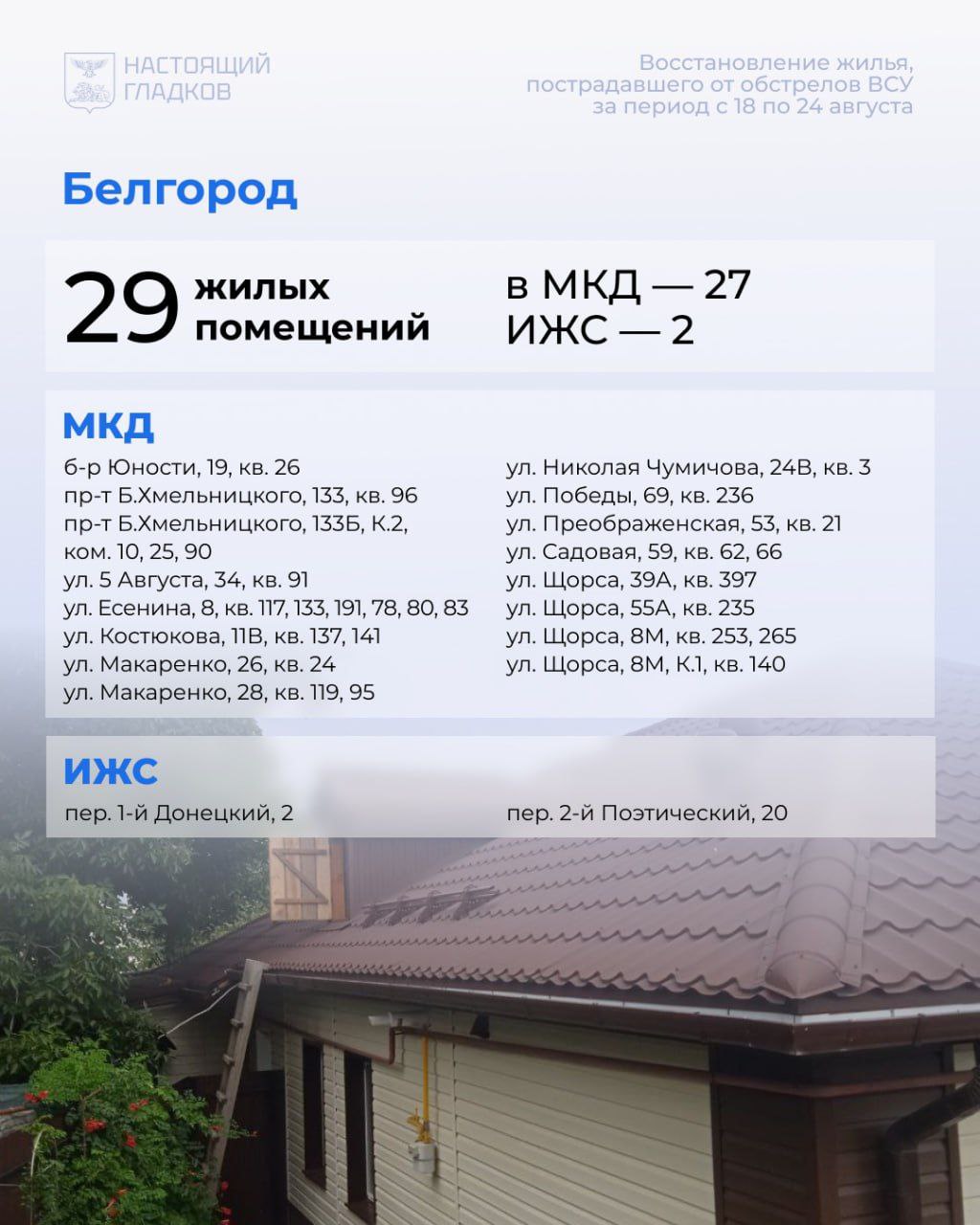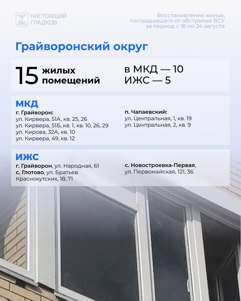 Список адресов, по которым восстановлены дома, опубликовал Вячеслав Гладков.
