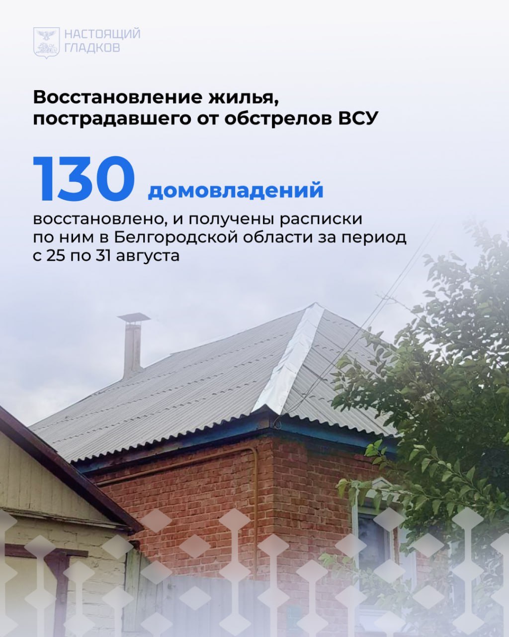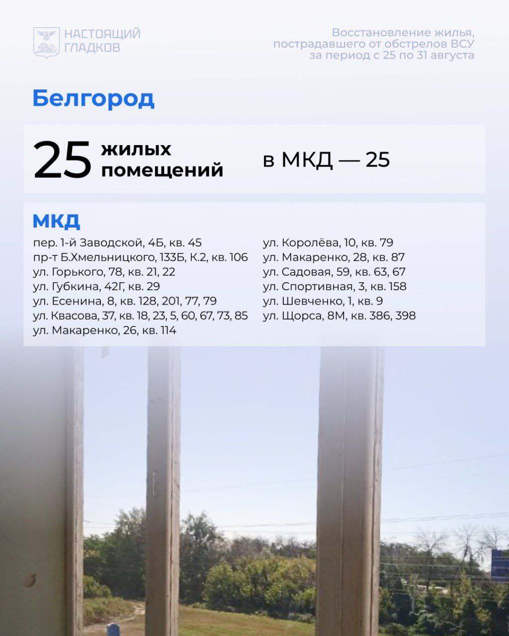 В Белгороде за прошлую неделю восстановили 25 объектов. За этот же период повреждения зафиксировали в 86 жилых помещениях.