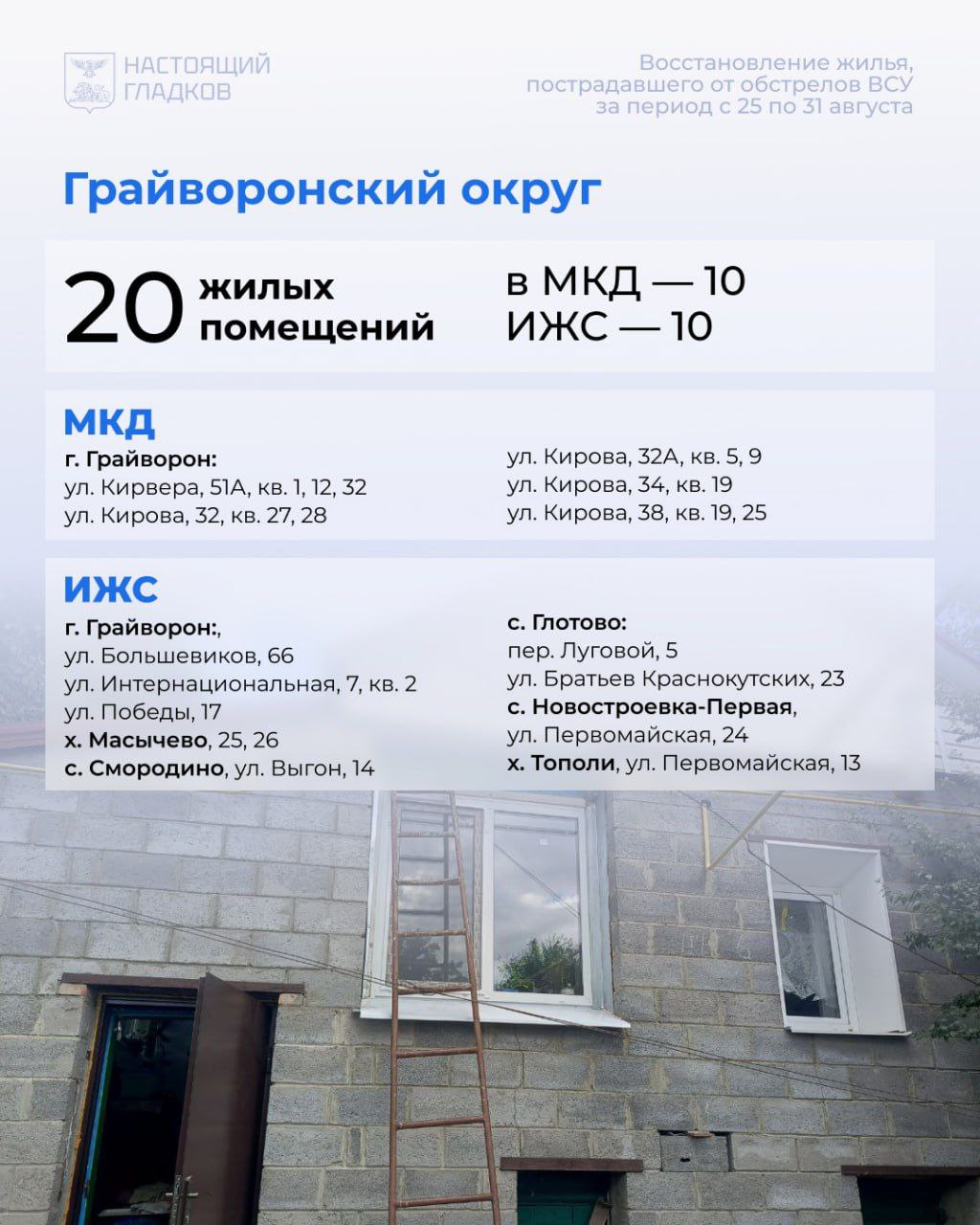 В Грайворонском округе восстановили 20 домов и квартир. За неделю повреждения выявили по 10 жилым помещениям и 12 машинам.