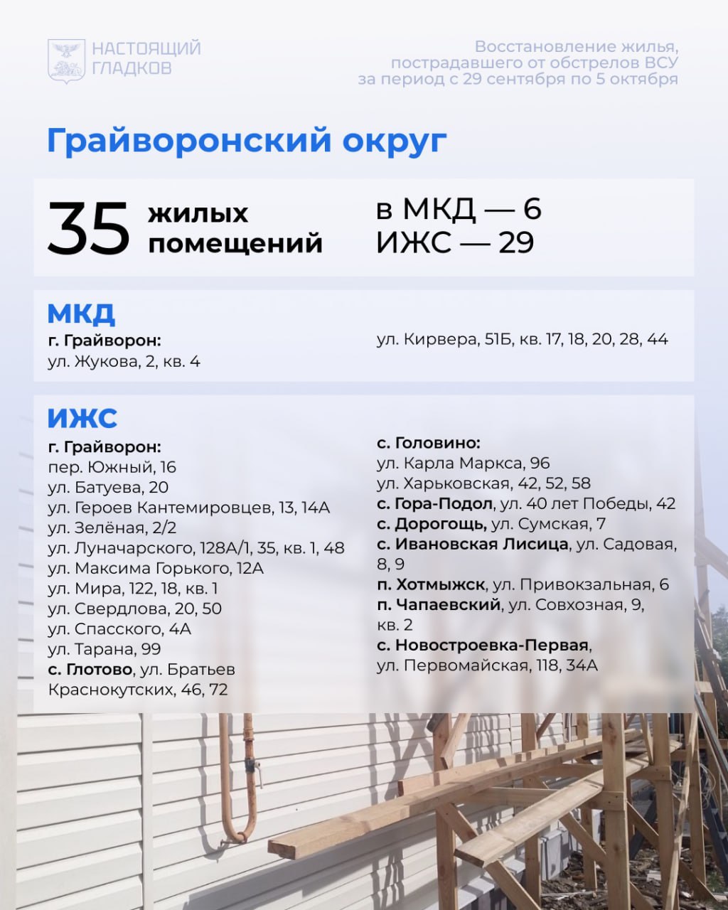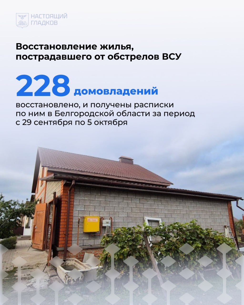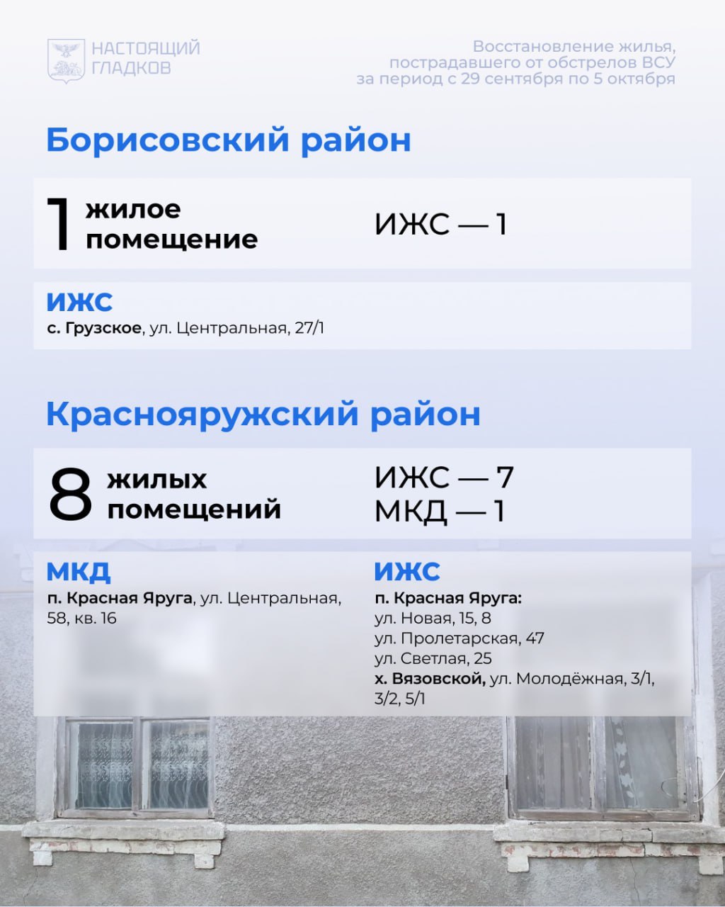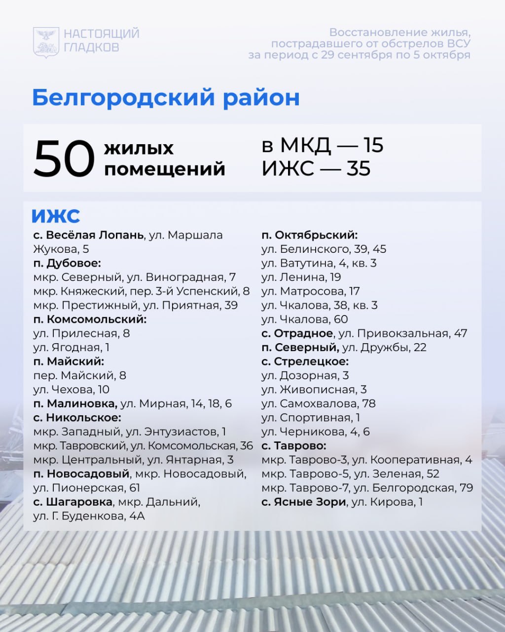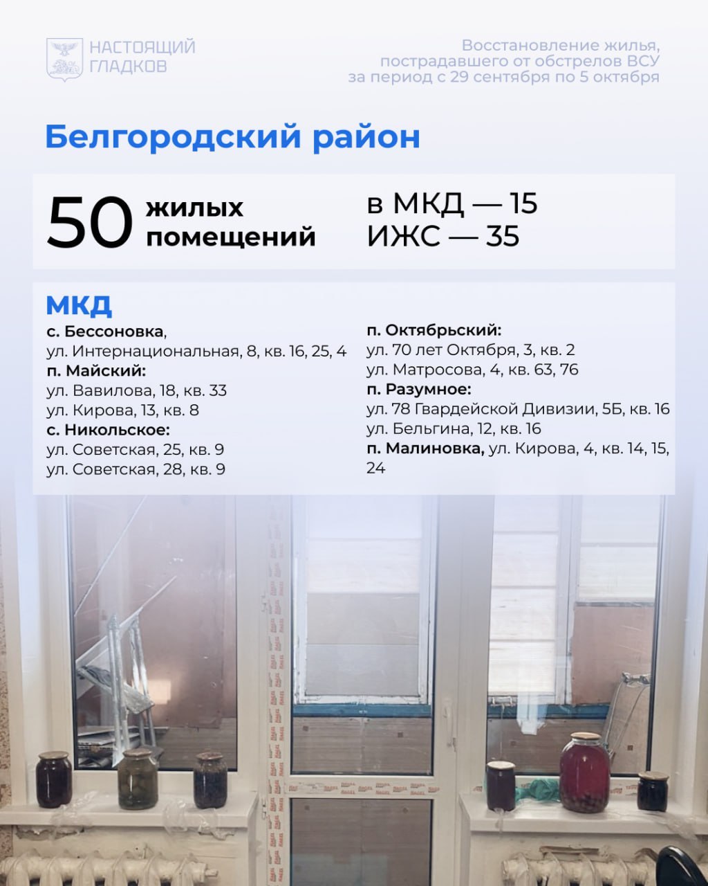 По Белгородскому району за неделю восстановлено 50 объектов. Прирост на 20 повреждённых жилых помещений и 25 авто.