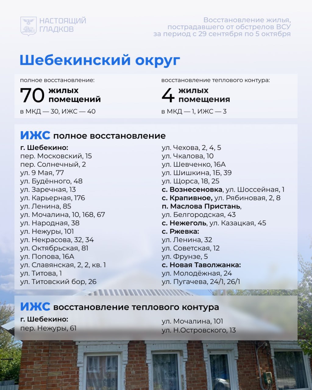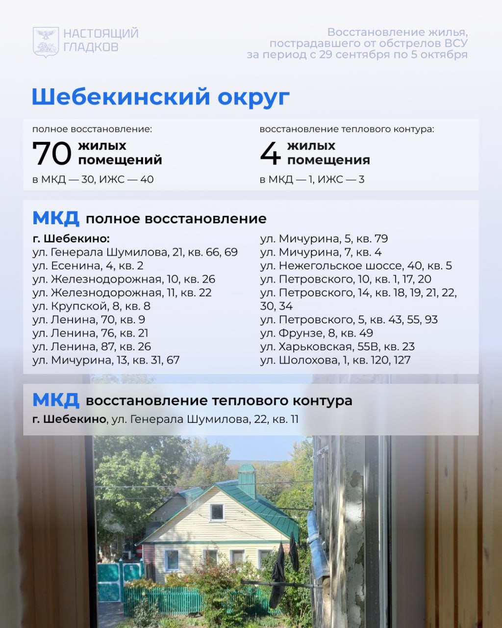 В Шебекинском округе восстановили 70 объектов, закрыли контур на четырёх. За неделю выявлены 25 повреждённых домов и квартир и 23 машины. Перечислены компенсации по 29 автомобилям.
