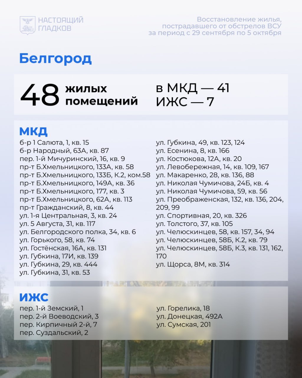 В Белгороде за прошлую неделю восстановили 48 объектов. За этот же период повреждения выявлены в 32 жилых помещениях, а также по шести машинам. В работе остаётся 301 объект.