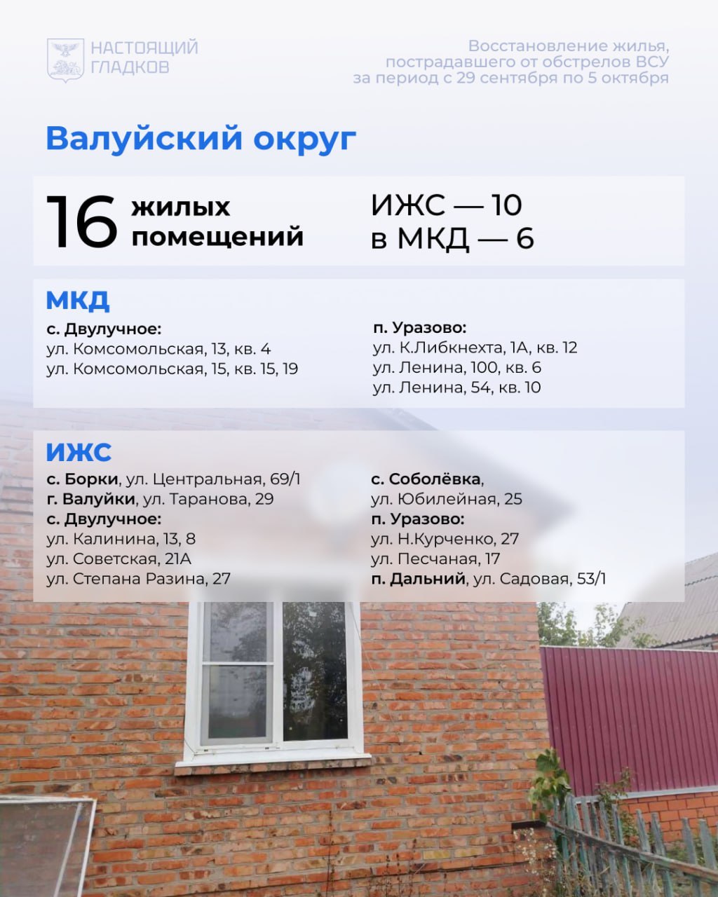 В Валуйском округе восстановили 16 частных домов и квартир, повреждены – 12. Выплачена компенсация по десяти авто.
