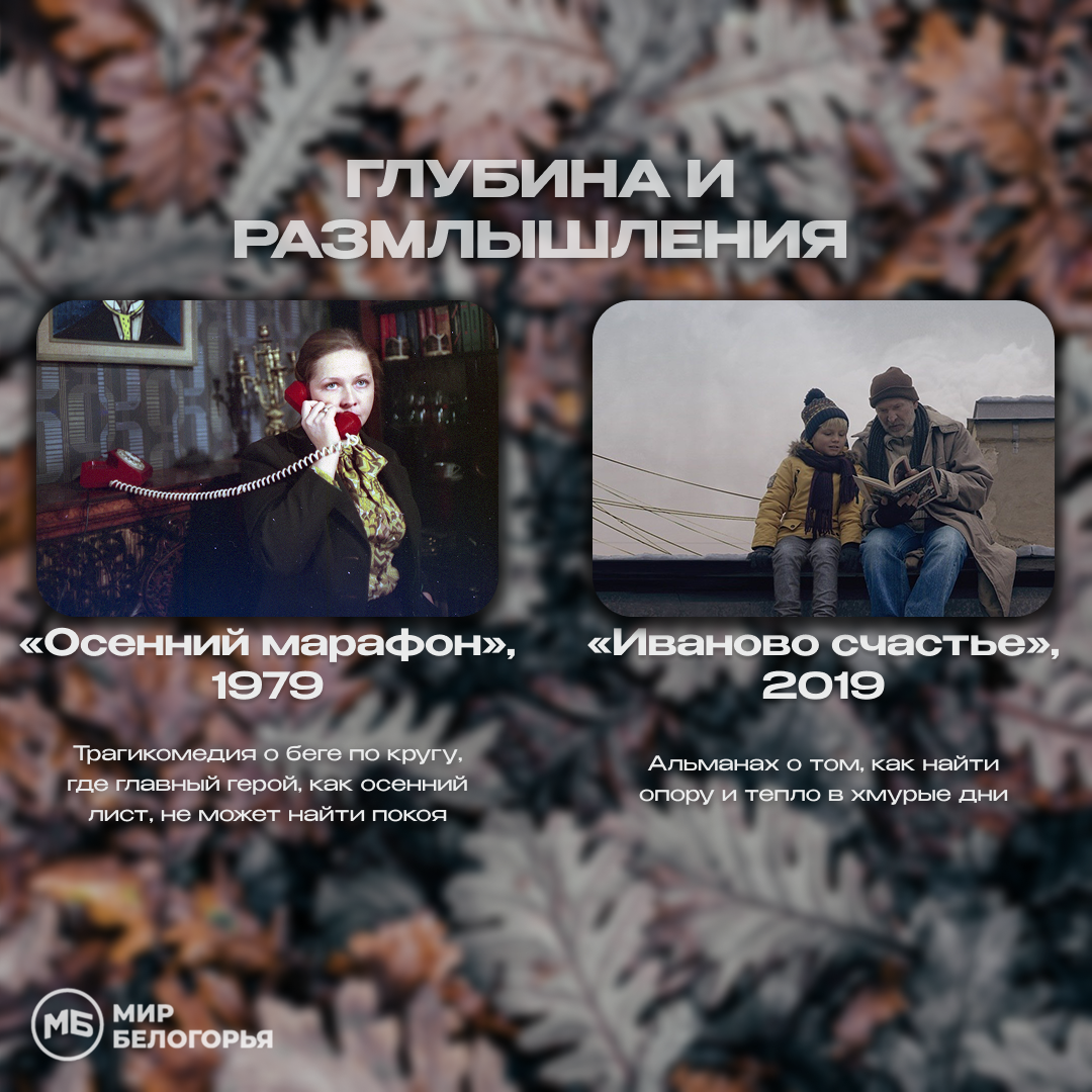 «Служебный роман».История о том, что в любом возрасте можно найти любовь, под главную осеннюю песню «У природы нет плохой погоды».