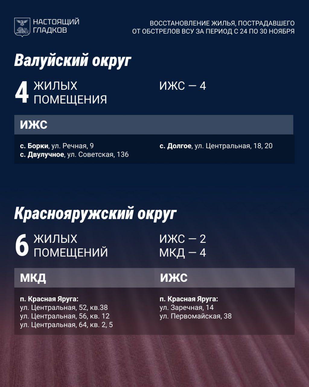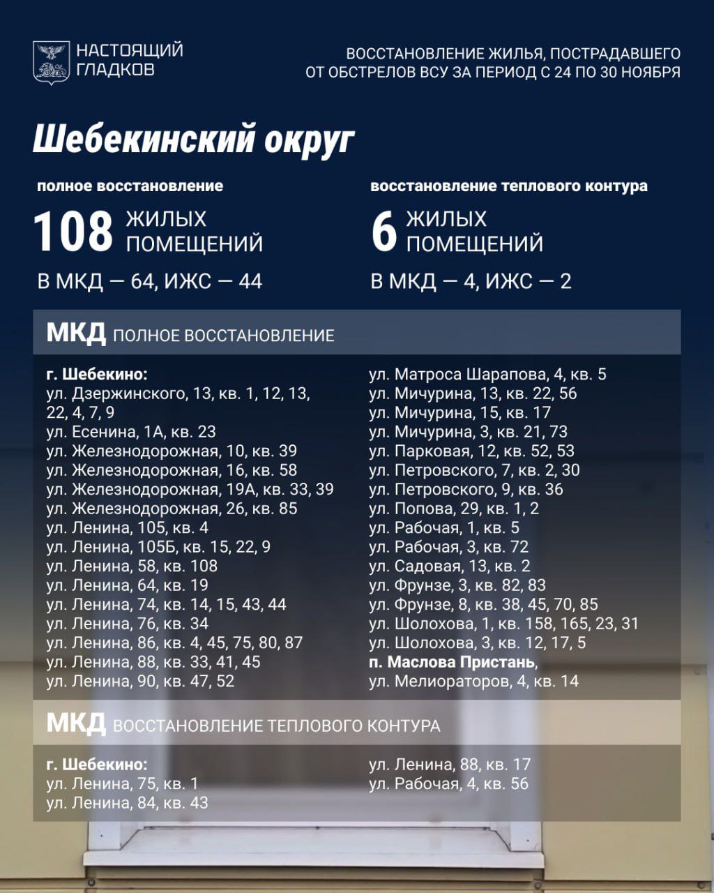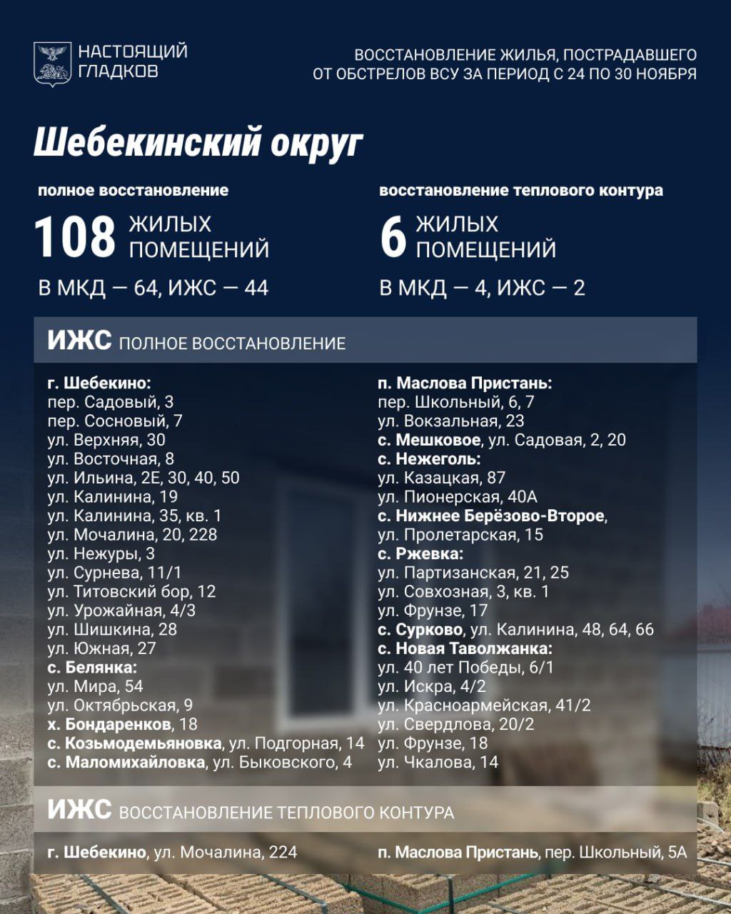 В Шебекинском округе восстановили 108 объектов, закрыли контур на шести. За неделю выявлено 64 повреждённых дома и квартиры, а также 12 машин.
