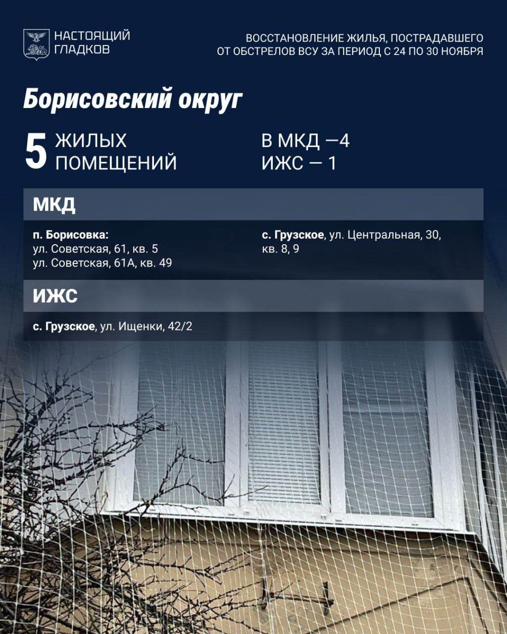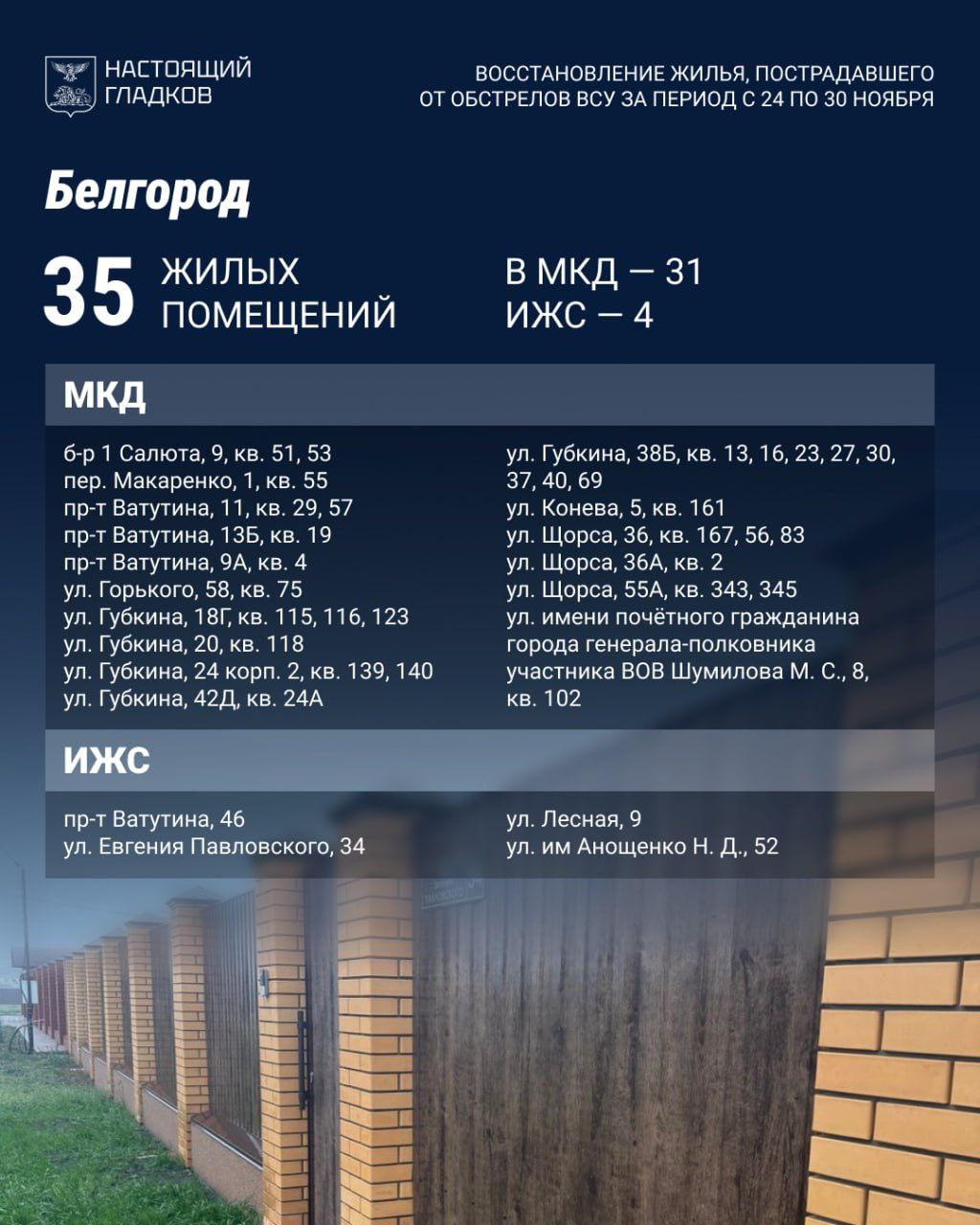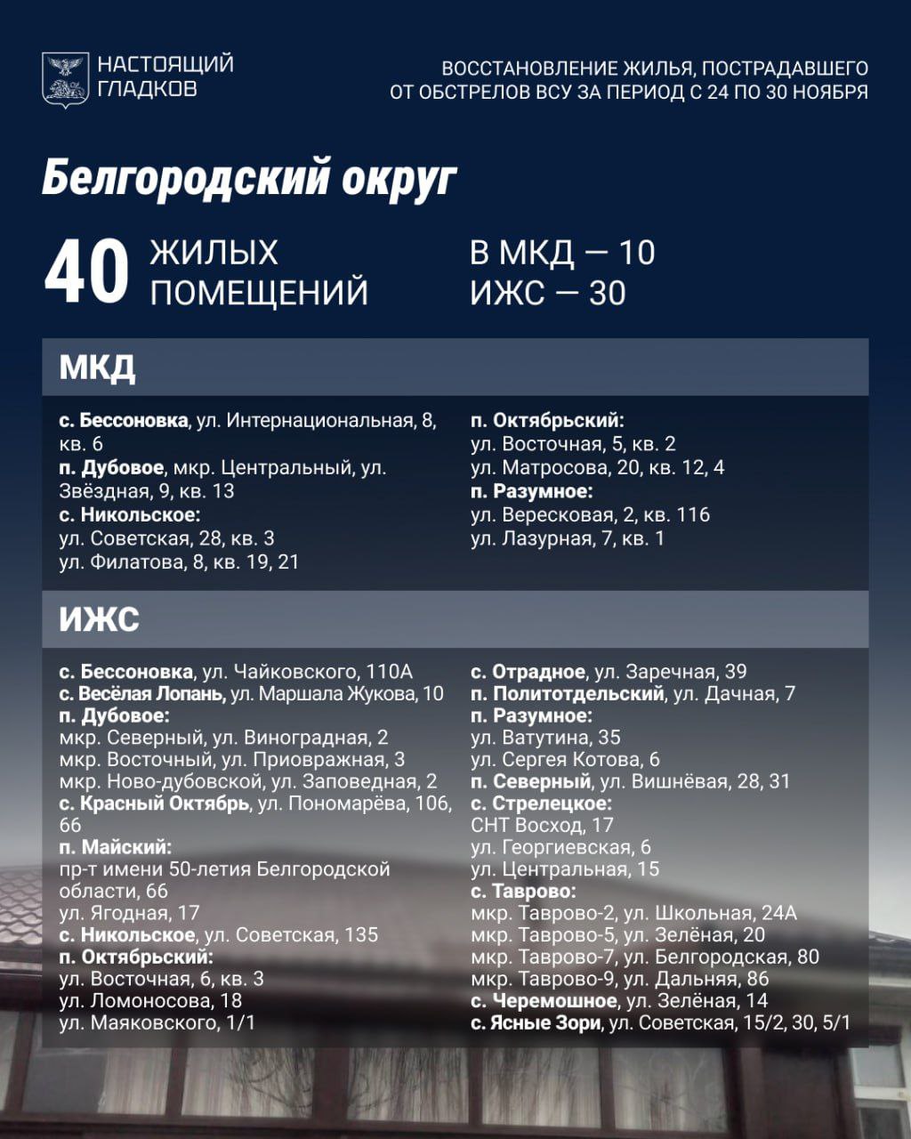 В Белгородском округе за неделю полностью восстановили 40 объектов. Прирост на 30 повреждённых жилых помещений и 21 автомобиль. Выплачена компенсация по 26 авто.