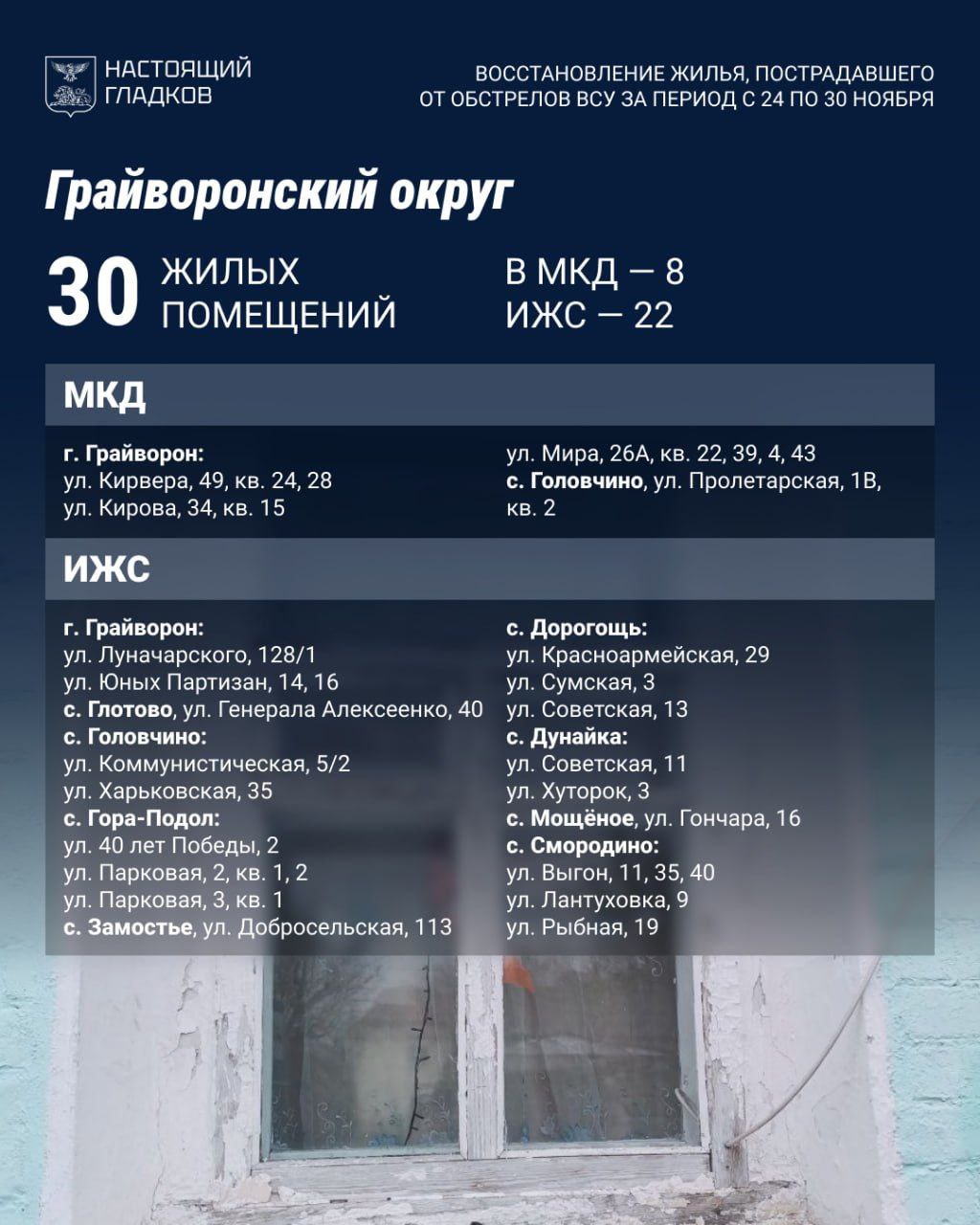 В Грайворонском округе восстановили 30 домов и квартир. Повреждения зафиксировали по 50 жилым помещениям и 38 машинам. Оплачена компенсация по 37 ТС.