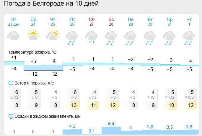 Днём температура опустится до –4…–5 °C, а ночью – до –12 °C. В выходные прогнозируется небольшое потепление: около –1 °C днём и до –4 °C ночью, возможен снег с дождём.