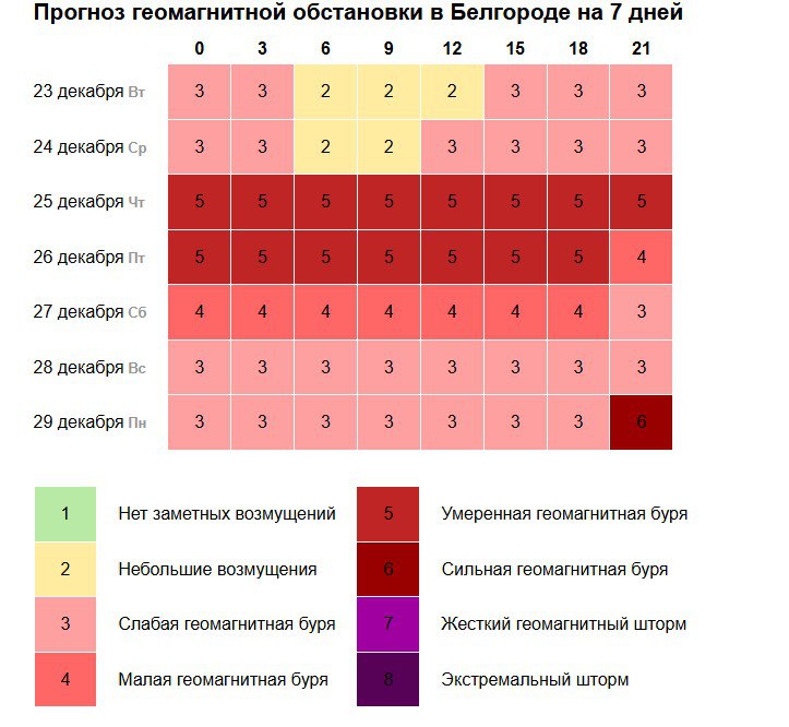 Кроме того, на регион обрушится сильная геомагнитная буря. 25-26 декабря ожидается умеренная активность, а 30 декабря – пик геомагнитных возмущений. В эти дни возможны головные боли. Могут наблюдаться резкие перепады настроения, упадок сил и депрессия.