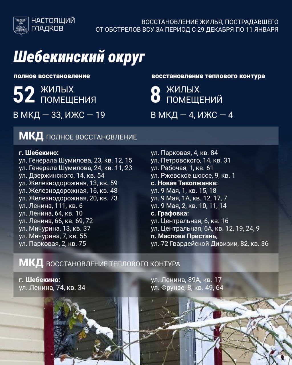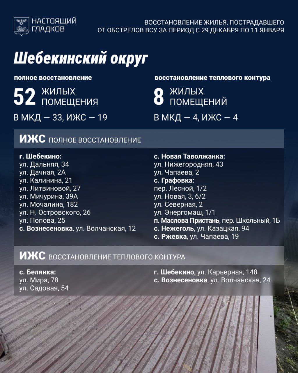 В Шебекинском округе восстановили 52 объекта, закрыли контур на восьми. За две недели выявили 21 повреждённый дом и квартиры, 16 машин. Выплачена компенсация по 77 автомобилям.