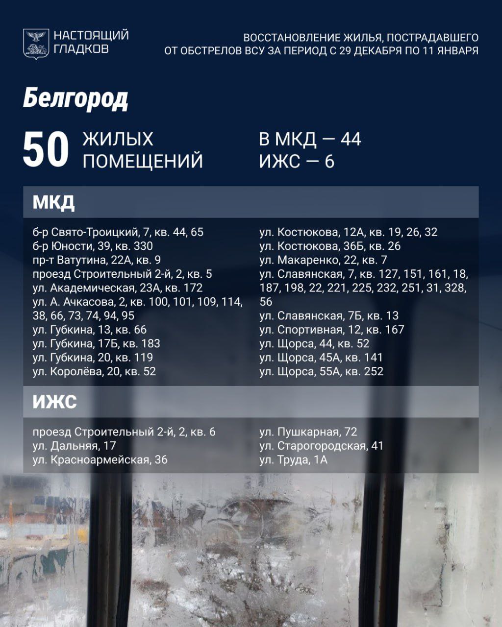 В Белгороде за прошедшие две недели завершили 50 объектов. За этот же период повреждения выявлены в 20 жилых помещениях, а также по 44 машинам. В работе остаётся 697 жилых объектов.