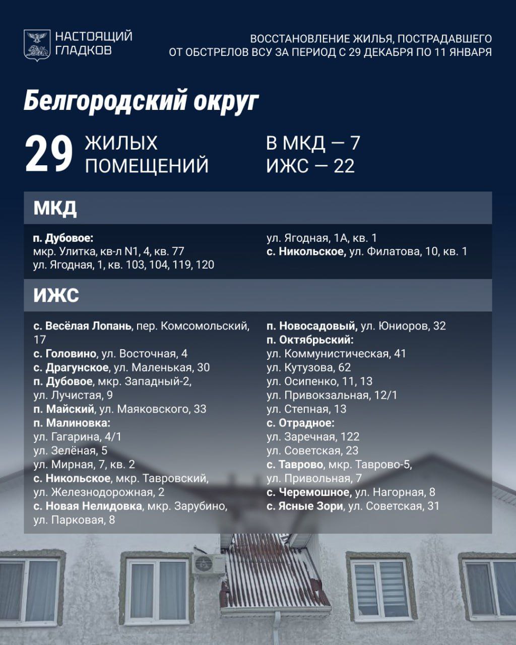 В Белгородском округе за две недели восстановили 29 объектов. Прирост на шесть повреждённых жилых помещений и девять автомобилей.