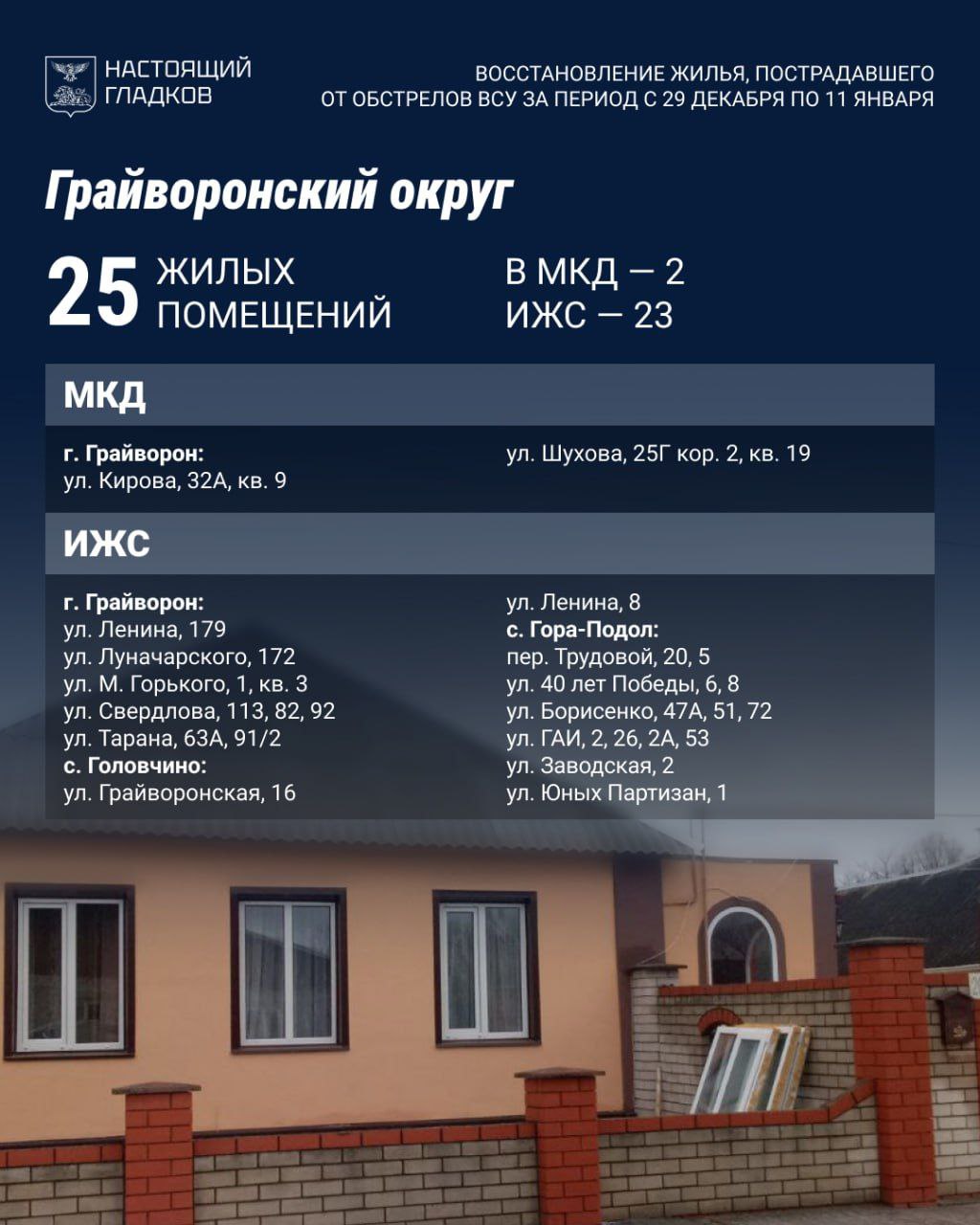 В Грайворонском округе восстановили 25 домов и квартир. Повреждения зафиксировали по 49 жилым помещениям и 71 машине.