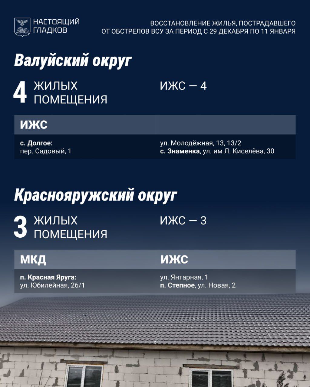 В Валуйском округе закончены четыре частных дома, повреждены 15 жилых помещений, а также восемь авто. Оплачена компенсация по 15 автомобилям.