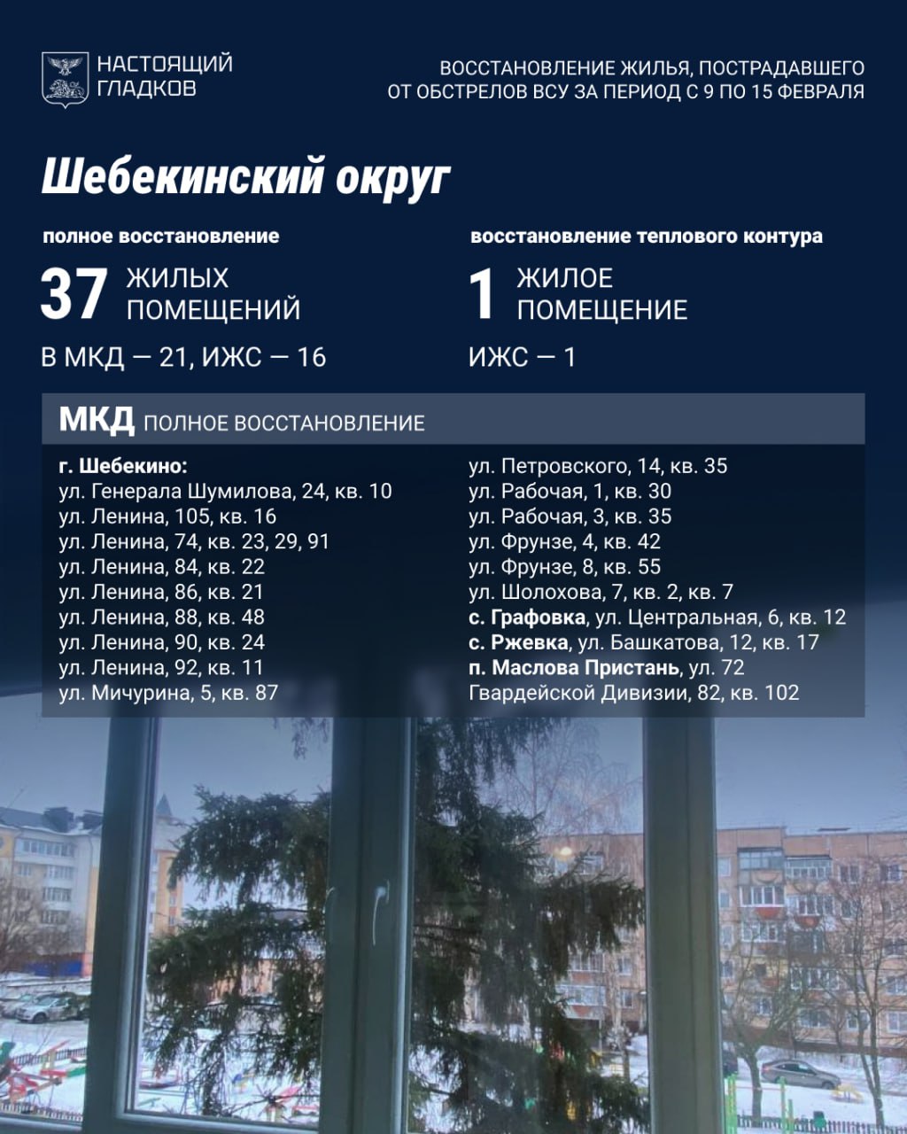 В Шебекинском округе восстановили 37 объектов, закрыли контур на одном. Выявлено 25 повреждённых домов и квартир, 11 автомобилей.