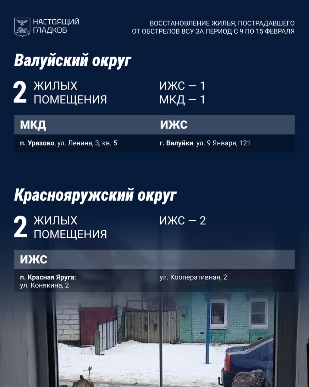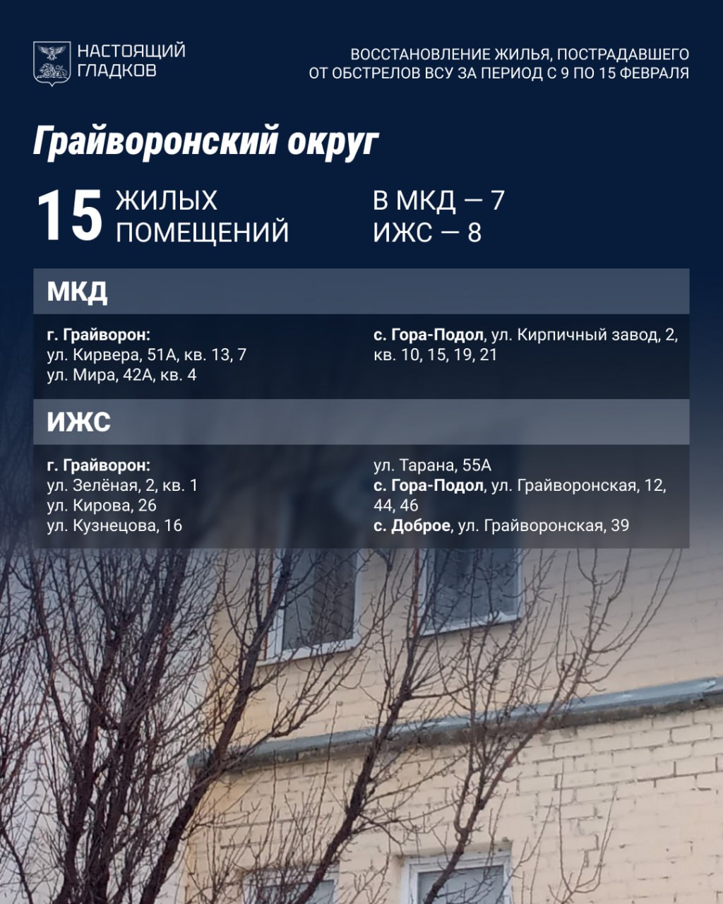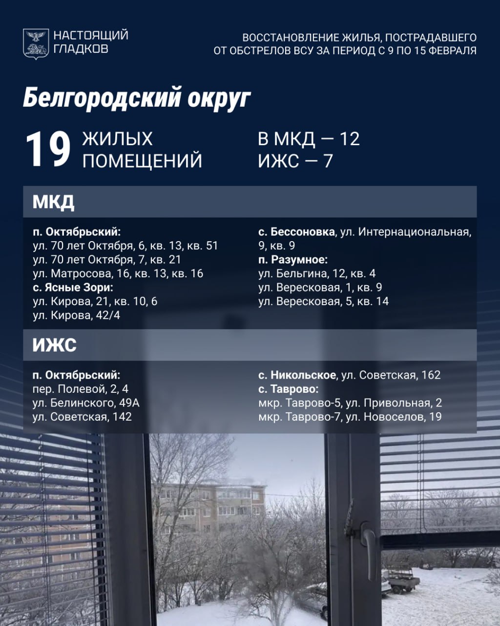 В Белгородском округе полностью восстановили 19 объектов. Прирост на 15 повреждённых жилых помещений и 97 авто.
