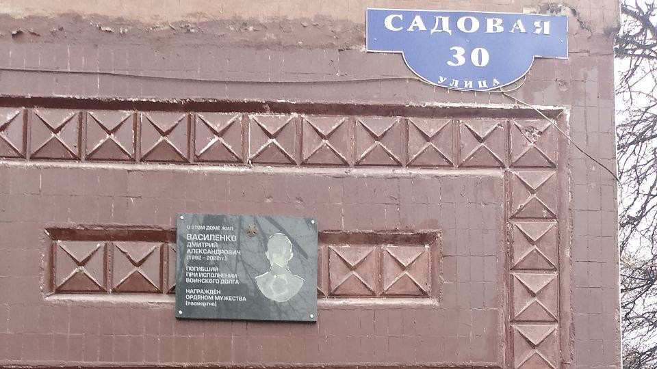 Табличка в память бойца Дмитрия Василенко установлена на доме №30 по Садовой улице, где жил герой.