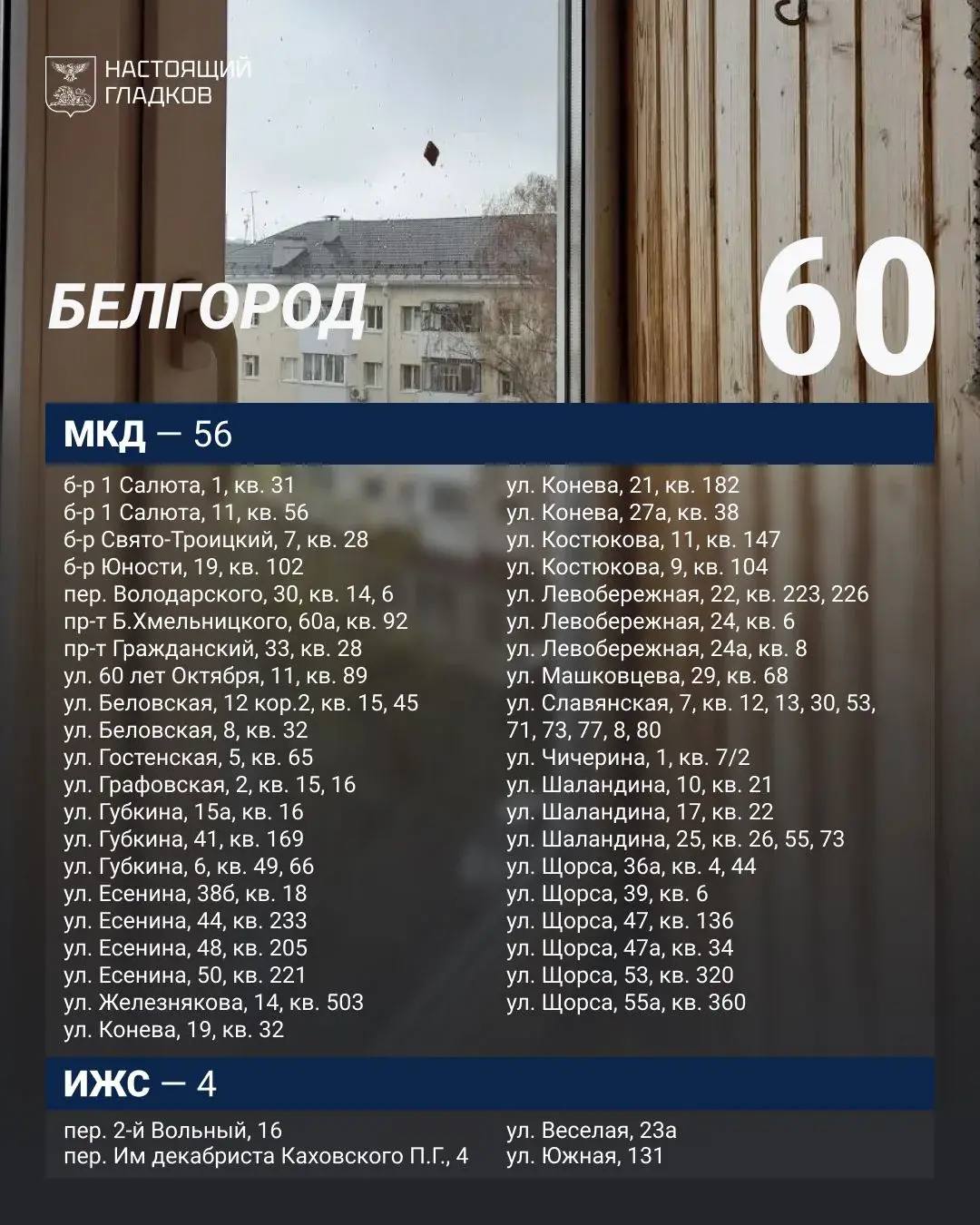 В Белгороде за прошлую неделю восстановлено 60 объектов. За этот же период повреждения выявлены в 48 жилых помещениях, а также по 17 автомобилям.